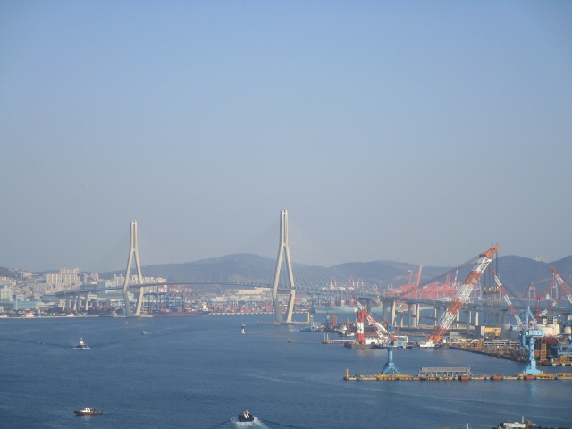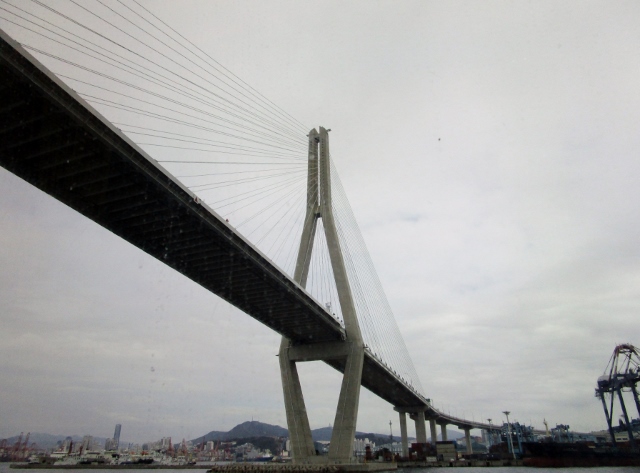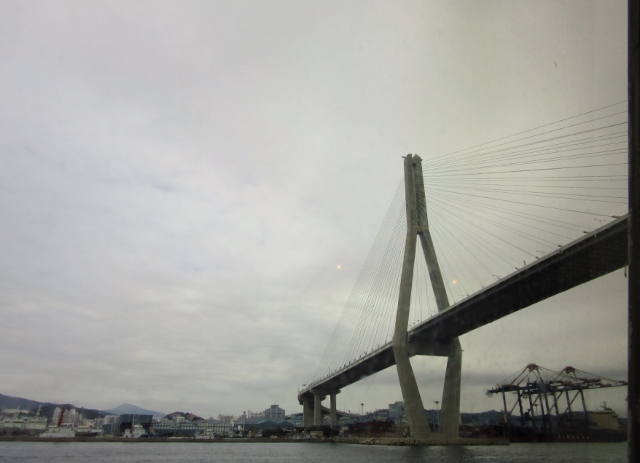 追記 2015年7月に博多からビートルを利用してふたたび釜山に行ったときに、釜山港でちょうどこの釜山港大橋をくぐって行きました。