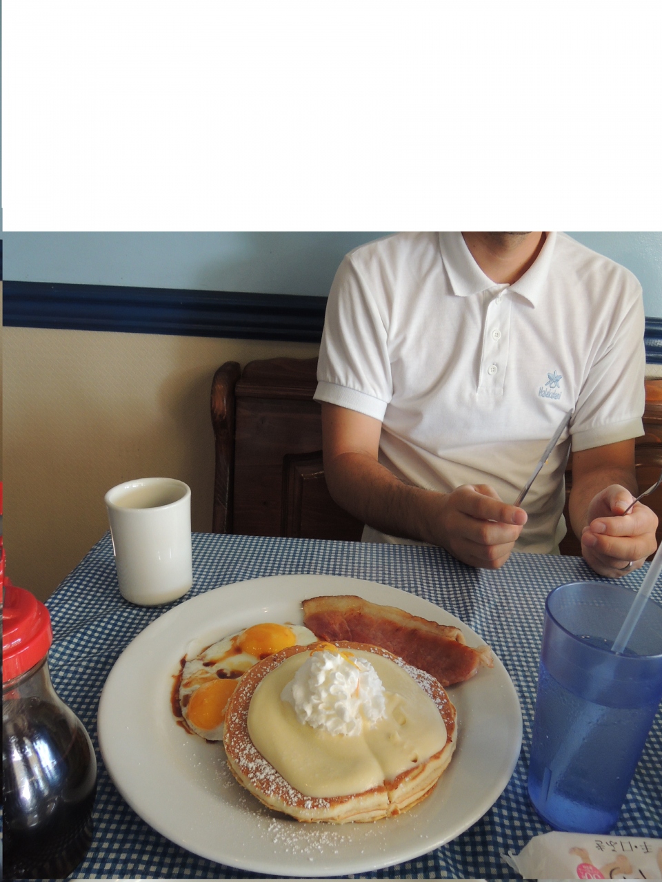 駐車場は道路のコインパーキングに停めます。オムレツのハムがとてもおいしいです。名物のリリコイパンケーキはソースが甘酸っぱくてとてもおいしいです。滞在中必ず行くお店です。ロコモケというロコモコがあり毎回食べたいのですが、朝8時台だとなかなか注文できませんね><コーヒーもおいしいですし、店員さんも愛想がいいです。子供がいるとお絵かきセットを持ってきてくれます。