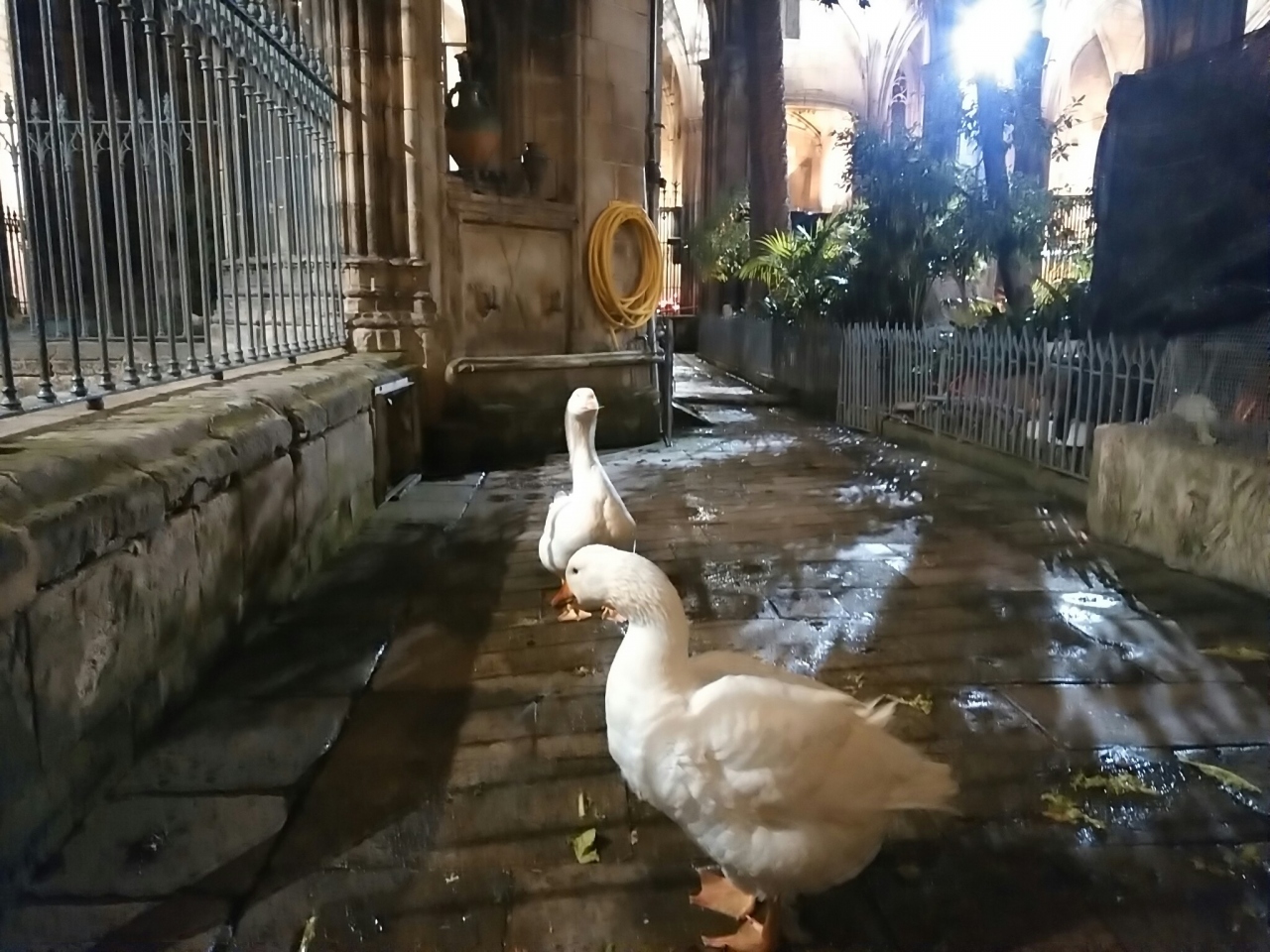 回廊の中庭には噴水があり、ガチョウが戯れています。