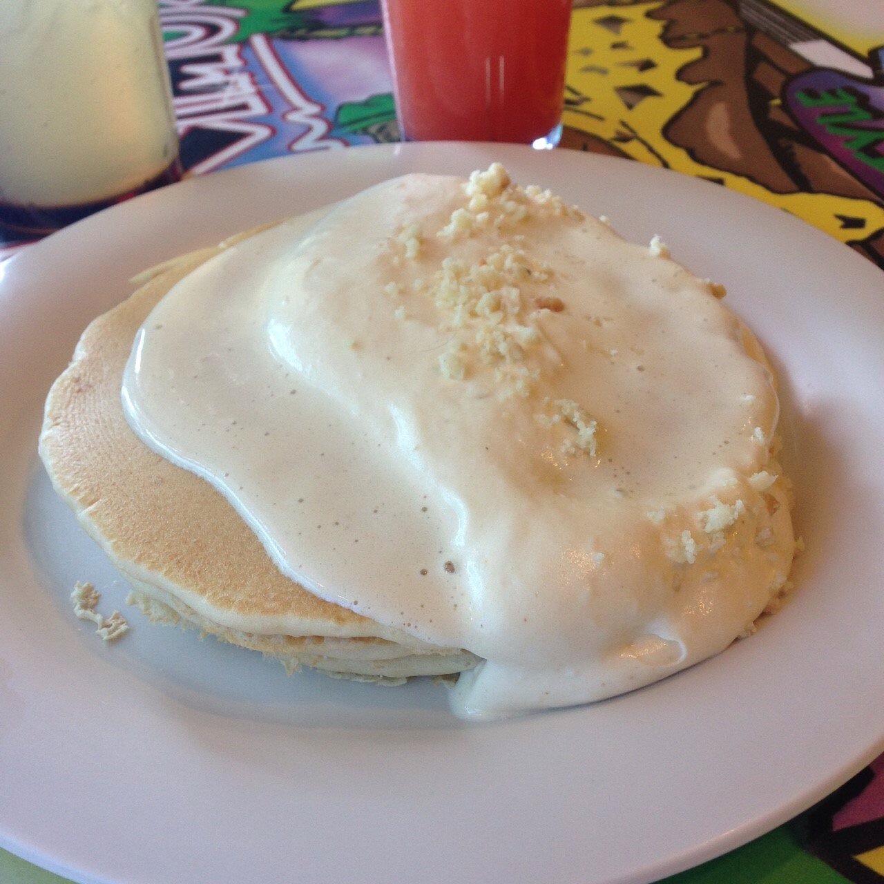 カイルアの朝市が目的だったので、マカデミアソースのパンケーキを2人でシェア。