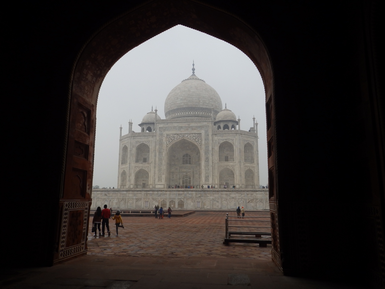 訪問した日はガスがかかっており、正門からはうっすらとしか見えない状況で、門内からタージマハルを撮ることは出来ませんでしたが、向かって右のモスクの入り口から似たようなアングルで写真を撮ることが出来ますので、憶えておいて損はないと思います。