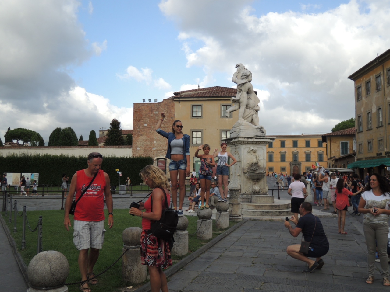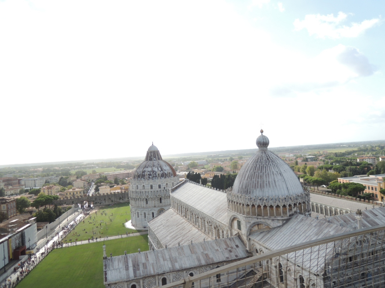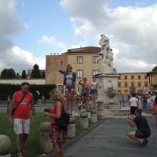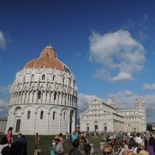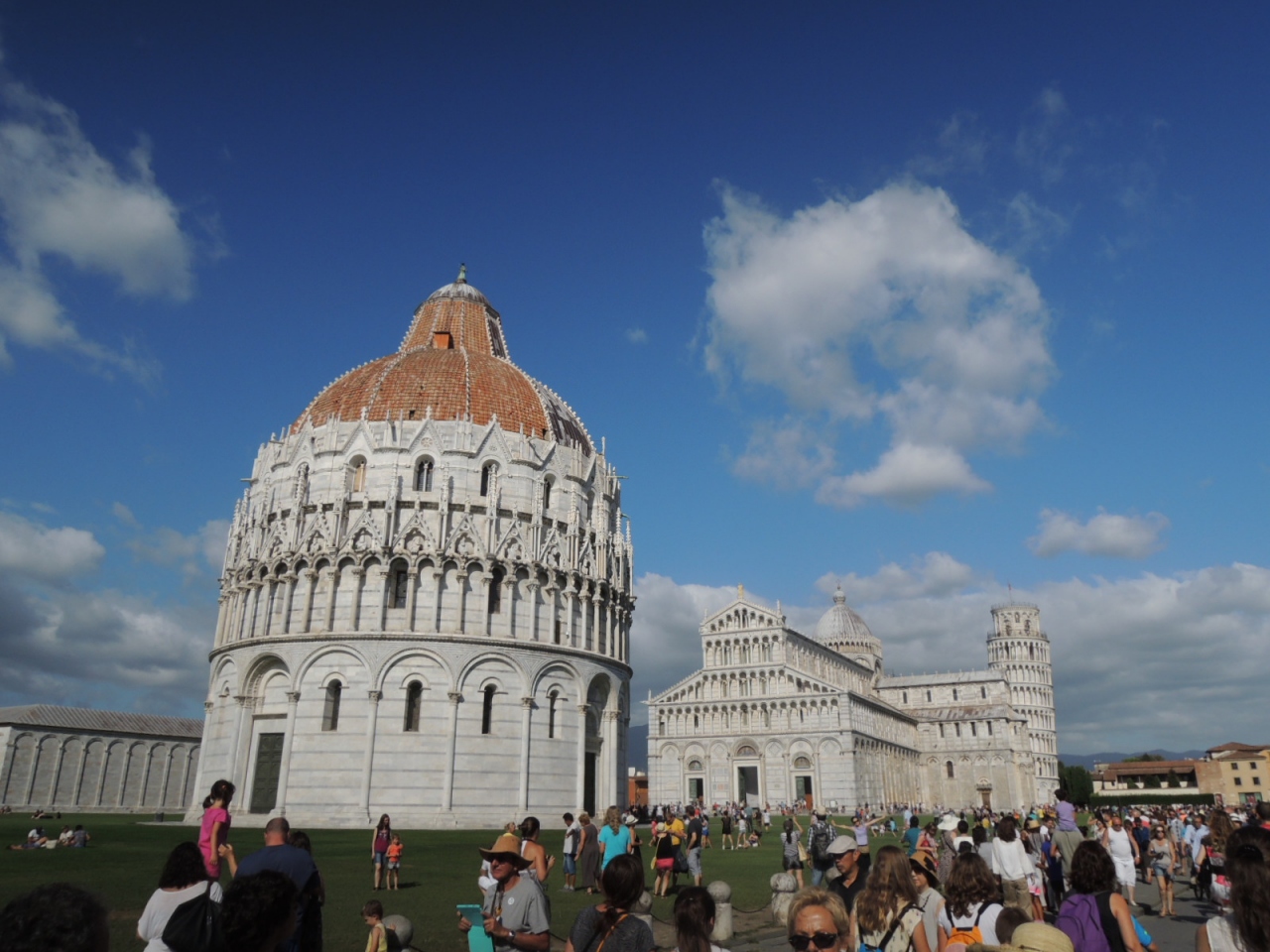 Pisa S. Rossore駅から歩いて辿り着いたピサのドゥオモ広場。観光客にあふれていますが、芝生に覆われていてとてもきれいです。立ち入り可の芝生には、ピクニックのように、座って見ている人たちも多数いて、気持ちよさそうでした。斜塔をバックに記念撮影をしている人たちは、斜塔をつまんだり、支えたりしているポーズで写真を取っているので見ていて面白かったです。