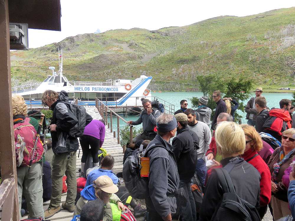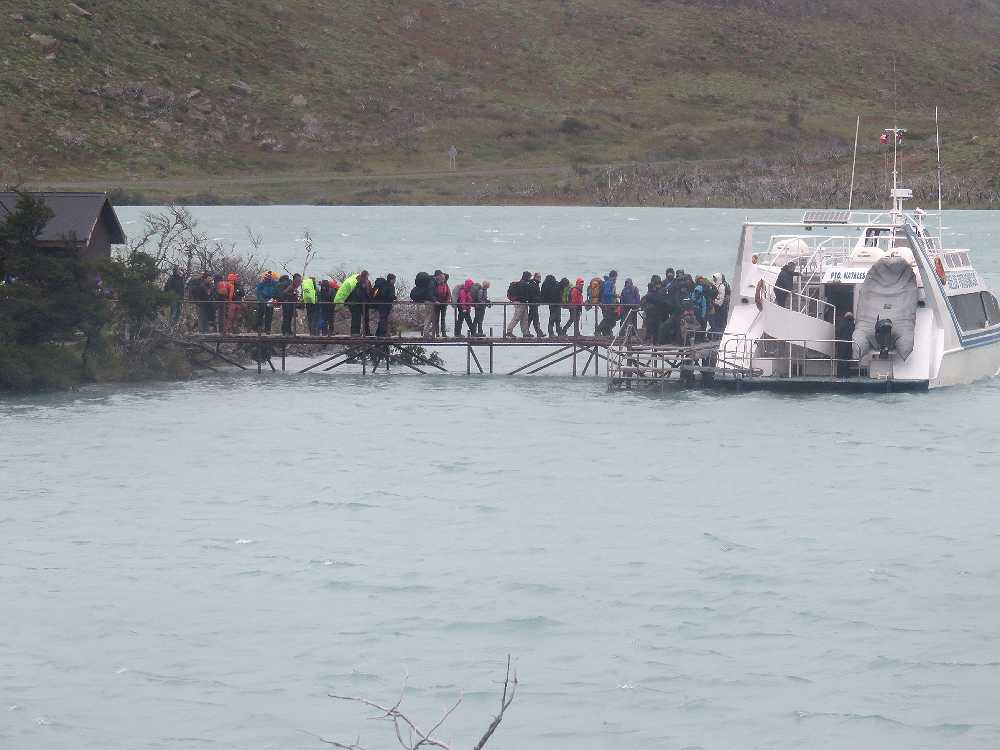 パイネ国立公園の中央部にあるペオエ湖畔にあり、そこから一日に3回(9:30,12:00、18:00)、対岸にあるロッジパイネグランデとの間をボートが往復している。プエルトナタレスを朝に出るバスは11時ごろプデートに着くので、出港まで1時間も待たされることになる。ここは強風ふき荒れるところで有名なところなのにもかかわらず、待合室もなく桟橋近くで冷たい風雨にさらされることになる。駐車場に小さいカフェとトイレがあるが、観光シーズンの12月から2月まではトレッカーが押し寄せるので、カフェで休んでゆっくりしていると定員オーバーで、そのボートが再び戻ってくるまで待たされることになるので、注意が必要だ。私たちが対岸に渡るときは幸い風もなく、いい天気だったので、桟橋近くの倒木の上に座って、昼食を食べながら待つことができた。帰りは10時発のボートでプデートまで戻り、1時発プエルトナタレス行きのバスを2時間半待つことになった。その日は最悪の天候で雨風が強く、立っていられないほどだったので、混雑するカフェになんとか2席確保し、コーヒーを飲みながら待っていた。偶然12時発のボートに定員オーバーで乗れなかったという日本人と一緒になり、話をすることができた。彼はあぶれて、1時間後まで待たなければならないといっていた。そういうこともあるのでみんな長い列を作って辛抱強く待っているのだということがわかった。Wトレッキングの際ボートに乗るときはウィンドブレーカーやバックカバーなどの風雨対策が必須だ。チケット売り場はなく、ボートに乗ってから買うことになる。チリペソか米ドルの現金のみで、カードは使えない。