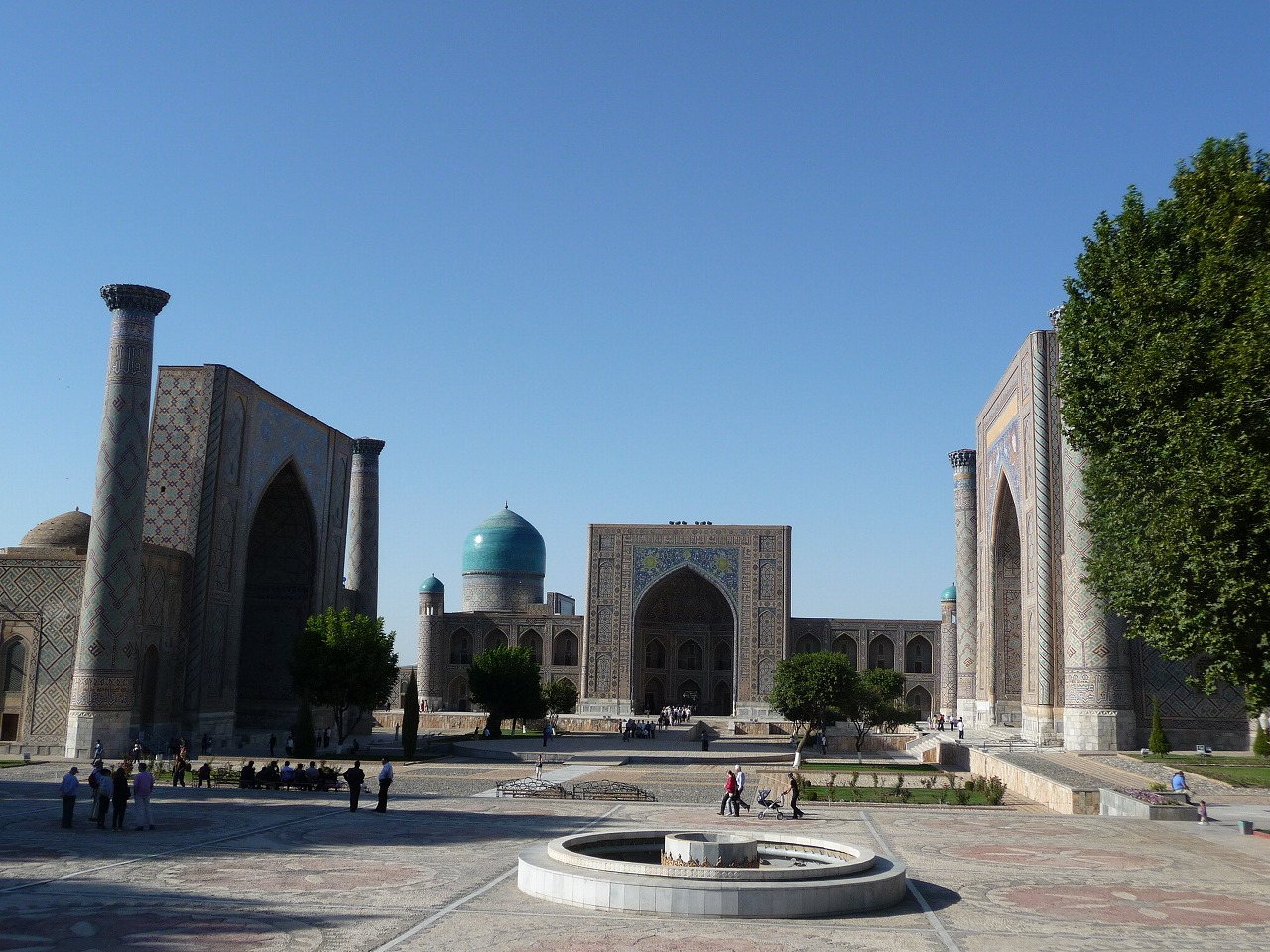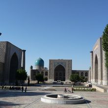 ★ウズベキスタン サマルカンド 「レギスタン広場」。「レギスタン」とは、「砂地」の意味。夜、ここで行われた音楽と光のショーは、とてもきれいでした。向かって左が、「ウルグベック・メドレセ」、右は、「シェルドル・メドレセ」、中央奥は、「テクラカリ・メドレセ」です。