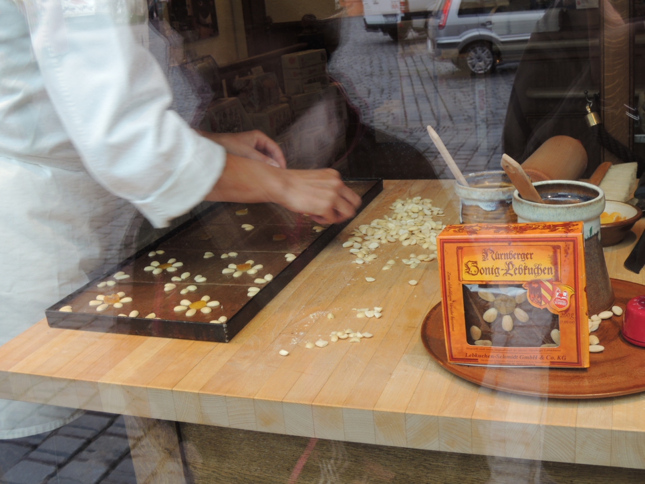 午前にレープクーヘンの老舗「レープクーヘンシュミット」に行ったら、にケーキ作りを見ることができました。飾りのアーモンドをのせて仕上げの制作中でした。「レープクーヘン」はクッキーとケーキの中間のような食感でスパイシー、「へーゼルとグレーテル」の童話に出てくるお菓子です。