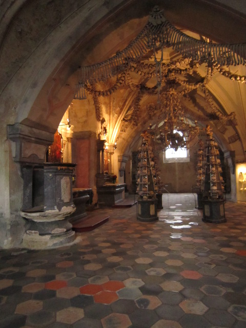 世界遺産 クトナー・ホラ聖バルバラ教会と歴史地区、セドレツの墓地教会は4万人の人骨で装飾された納骨堂が世界的に有名です。骨はペストやフス戦争での戦没者のものだそうで、シャンデリアや十字架などが遺骨で飾られているなんて、世界でも珍しいです。クトナー・ホラ駅から20分ほど歩きます。