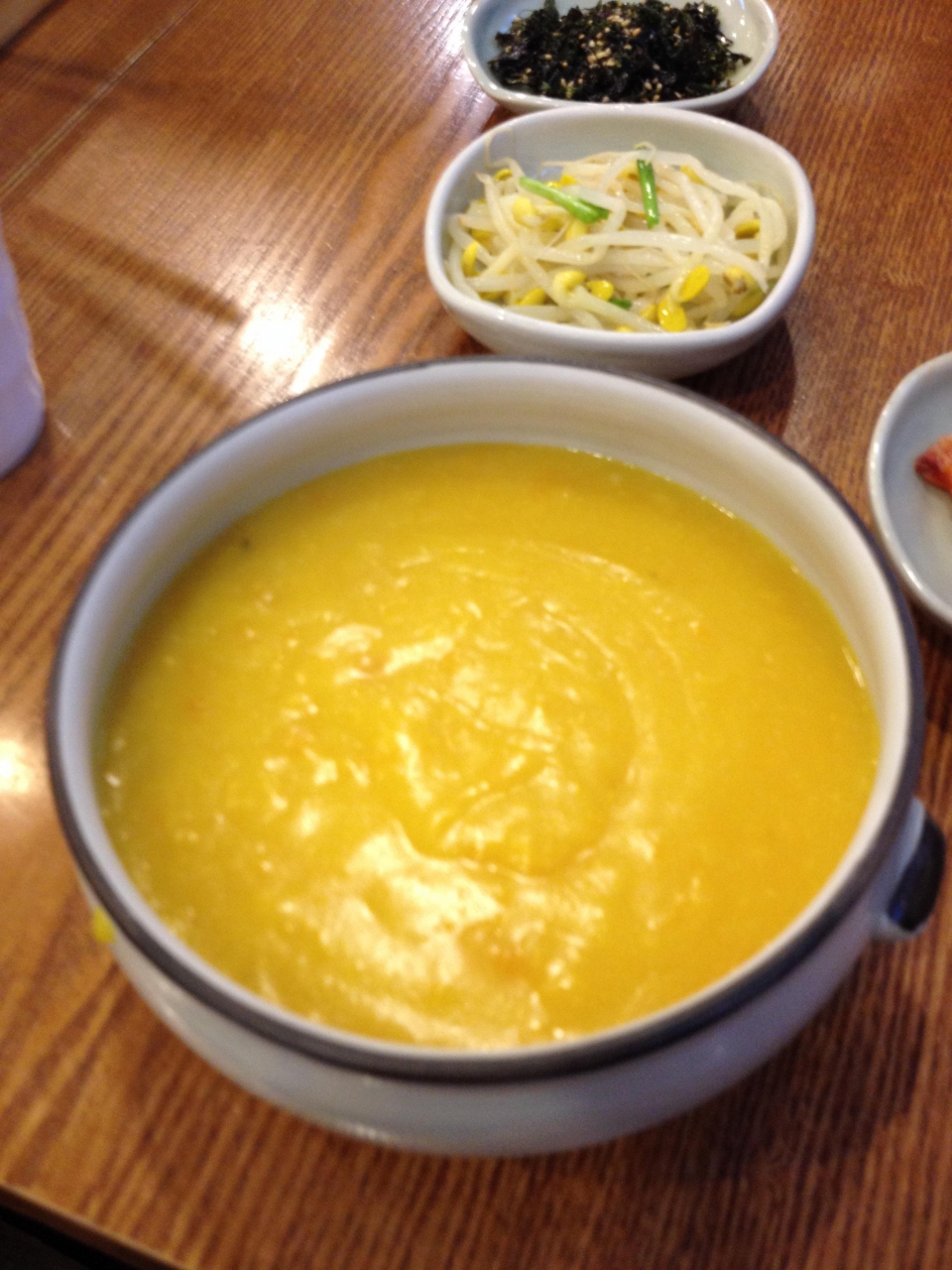 お店自体は結構広いのですがお客は日本人が1組のみ。ウィークデーということもあるのでしょうが、現地の方はこの辺りでは朝食は取らないということなのでしょう。カボチャのお粥を頼みましたが非常にクリーミーで美味しかったです。また、自家製のキムチもとても美味しく、お土産に買って帰ることも出来るようでした。