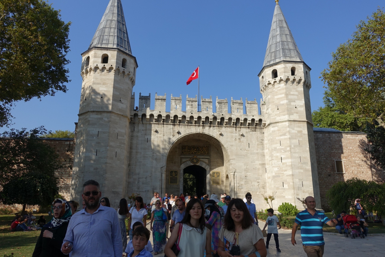 宮殿に入って宝物館、ハレムなどを見学するにはこの表敬の門を通ります。ここから先は有料エリアですが、チケット売場は門の数十メートル手前の庭園の一角にあります。人気の観光地だけあってチケット売場には窓口が何か所もあるのに列ができていました。