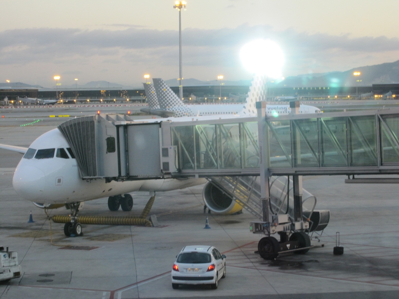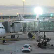 いずれもブエリング航空で、パリから到着した際、グラナダへ出発する際の2度利用しました。第1ターミナルと第2ターミナルがありますが、なぜか第1ターミナルが新しいターミナルで、ブエリング航空は第1ターミナルを利用していました。綺麗で利用しやすい空港でした。格安航空のブエリング航空もボディングブリッジを利用しての搭乗(写真参照)でした