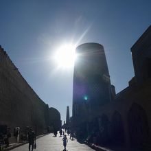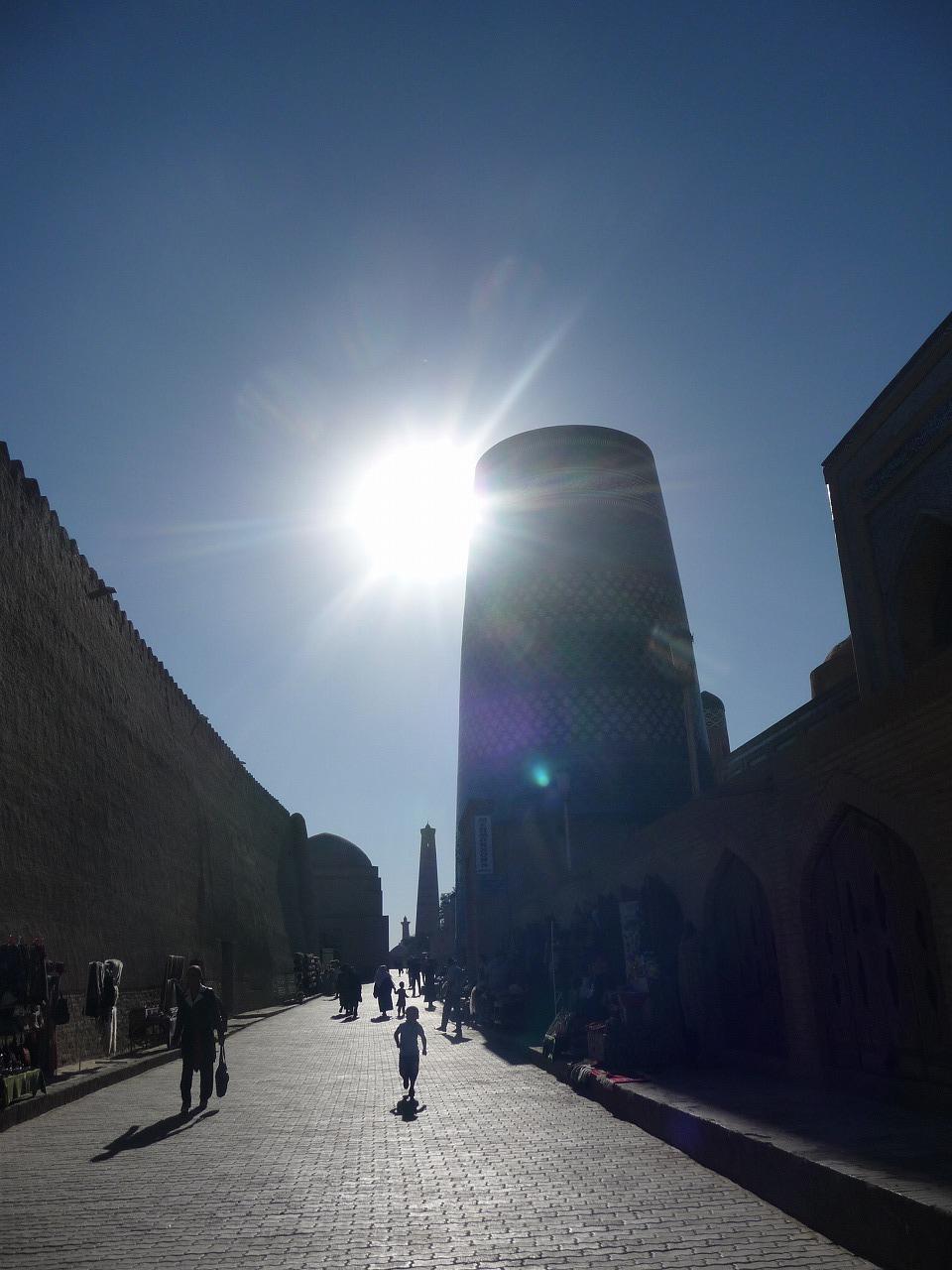 ★ウズベキスタン ヒヴァ 西門を入ったところ、メインストリート「パフラヴァーン マフムード通り」 を行くと、朝日に照らされた、カルタミナルが忽然と姿を顕わします。写真は、朝、9時ごろです。9月中ごろで、夜は、10度程度だったのが、朝日と共に、気温が急上昇し、この照り返しです。