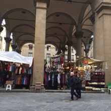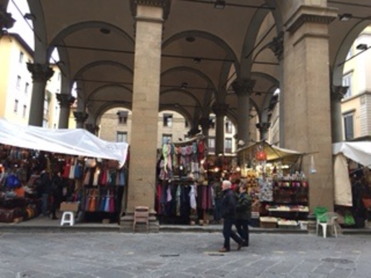 シニョリーア広場から西へ少しいくとアーチのある露天市場につきます。朝通った時には、懸命に出店準備していましたが、昼には、所狭しと、革製品の露天が並んでいました。有名なイノシシがあることを忘れており、鼻を触れませんでした。