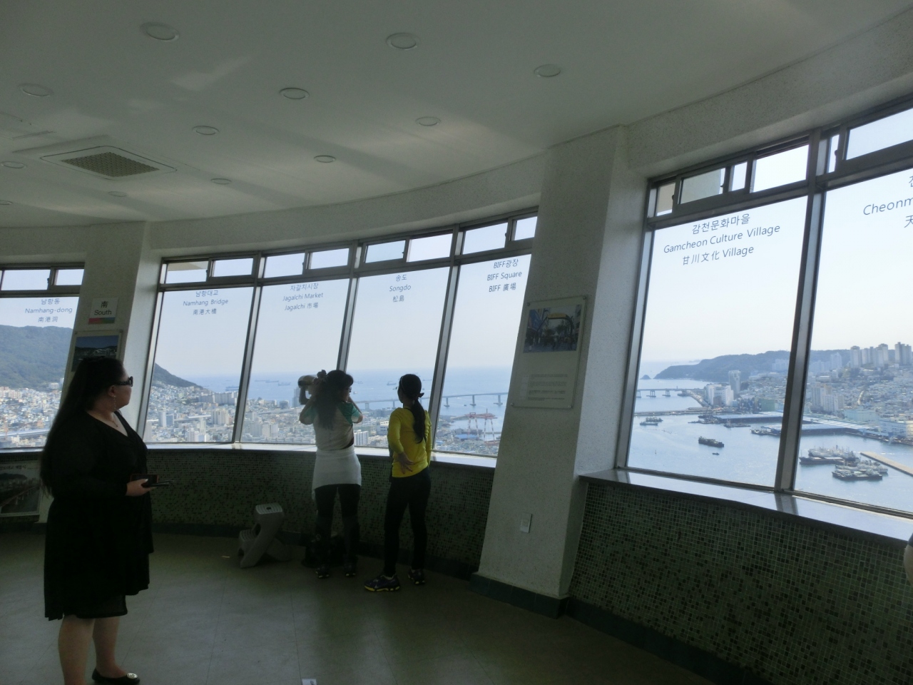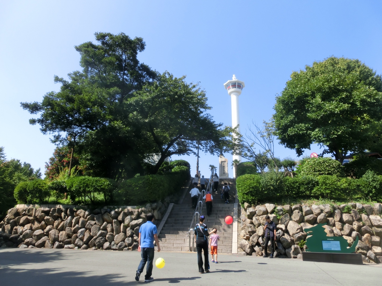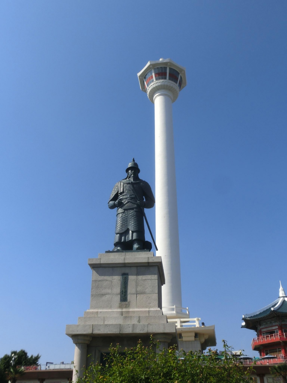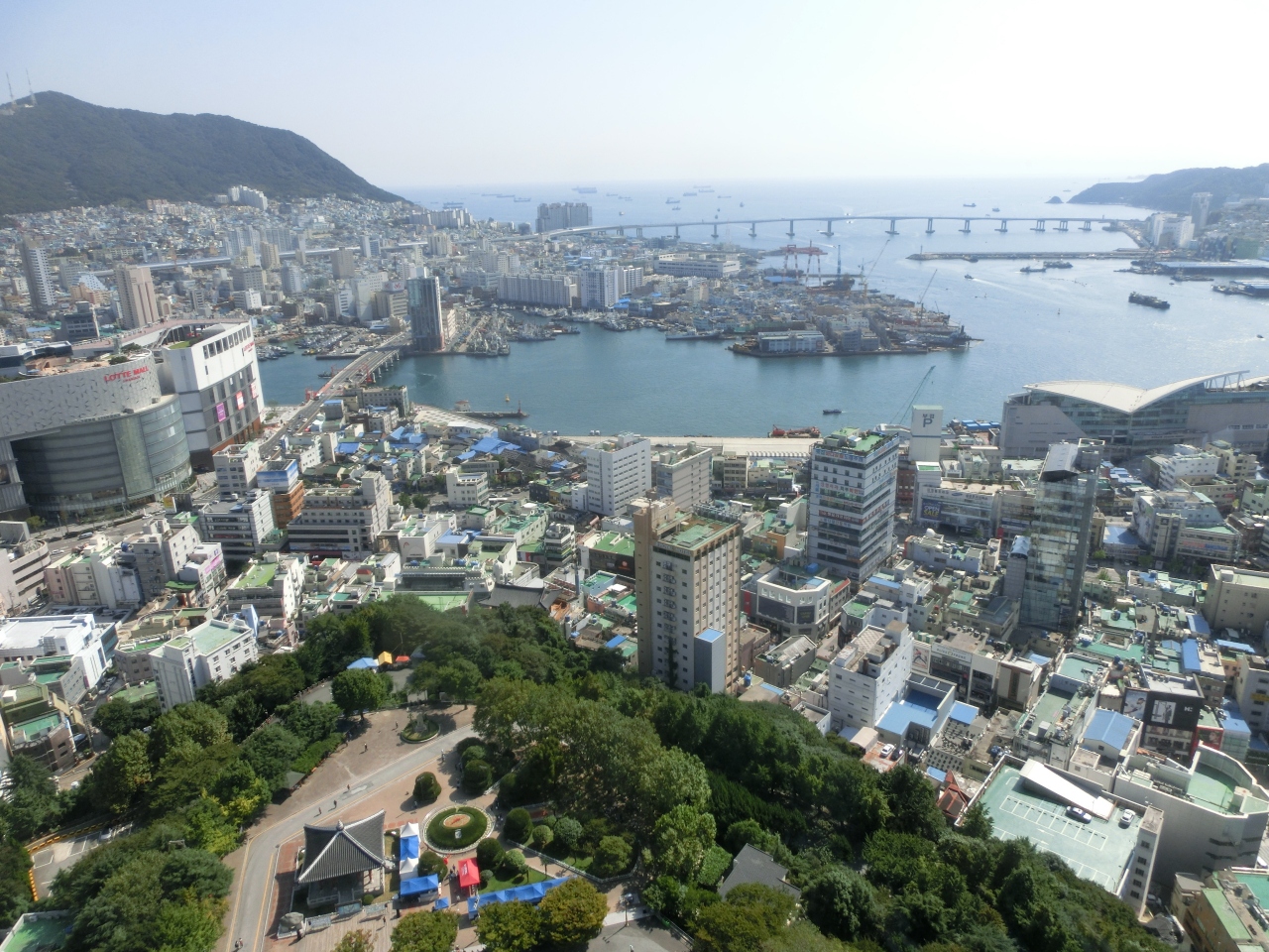 釜山タワー、高さは120mで あまり高くないと思われがちですが、ここは龍頭山という丘の上、山そのものが189mあるわけですから 全部で300m超え、東京タワーの展望台よりも高いという事になります。登れば釜山の街並みが一望、港、遠くには小島も。これだけで十分楽しめます。