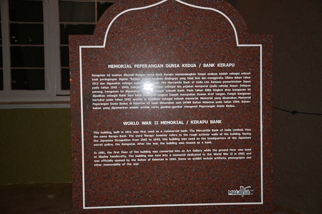 古い王宮を建て直して作られた博物館街のカルチャーゾーンにある。ここは名前から想像できる通り戦争に関わる資料、展示物ある。日本軍がコタバルに上陸した石碑、資料、日本語の資料も多くあるなど、第二次世界大戦に関わる歴史的資料が多く展示されている。