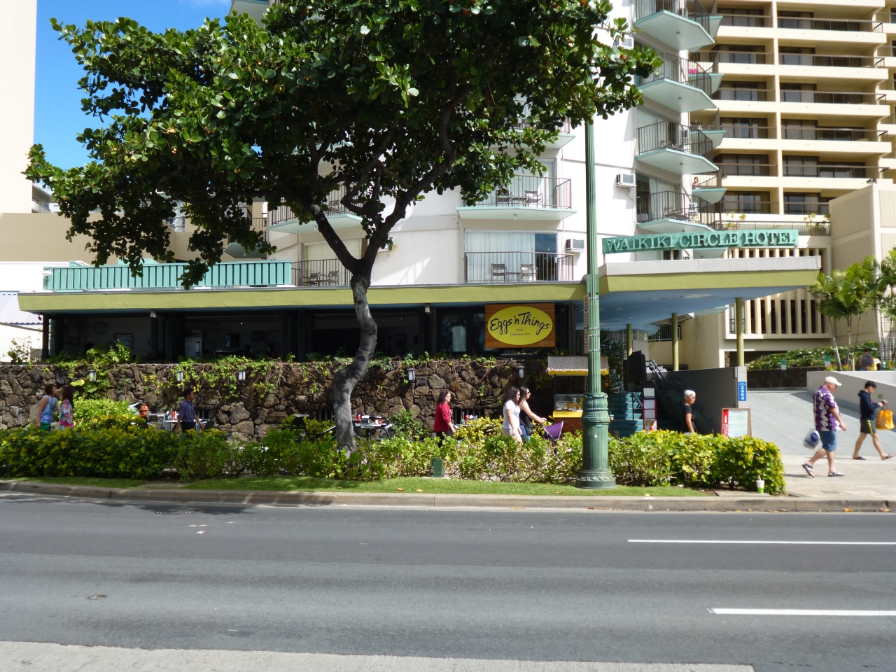 エッグスン シングスはワイキキに複数の店舗がありますが、ここはカラカウア通りにあるお店です。カラカウア通りを歩いているときに見ると大抵列ができていたのですが、たまに列がないのでその際の入店を狙うのがお勧めです。モチモチしていておいしいですが、かなりボリュームがあります!