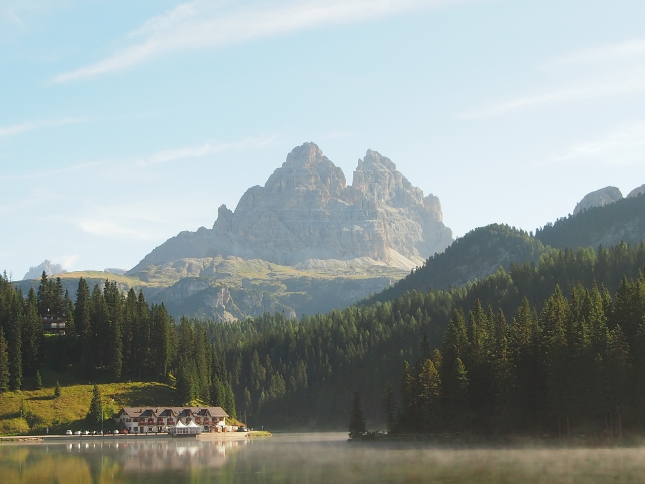TreCimeトレッキングに向かう際に立ち寄りました。朝もやの中のミズリーナ湖はよくある旅行会社のパンフレットの通り美しい湖でした。その先に見えるTre Cime di Lavaredoはここからは3つではなく2つの頂しか見えません。