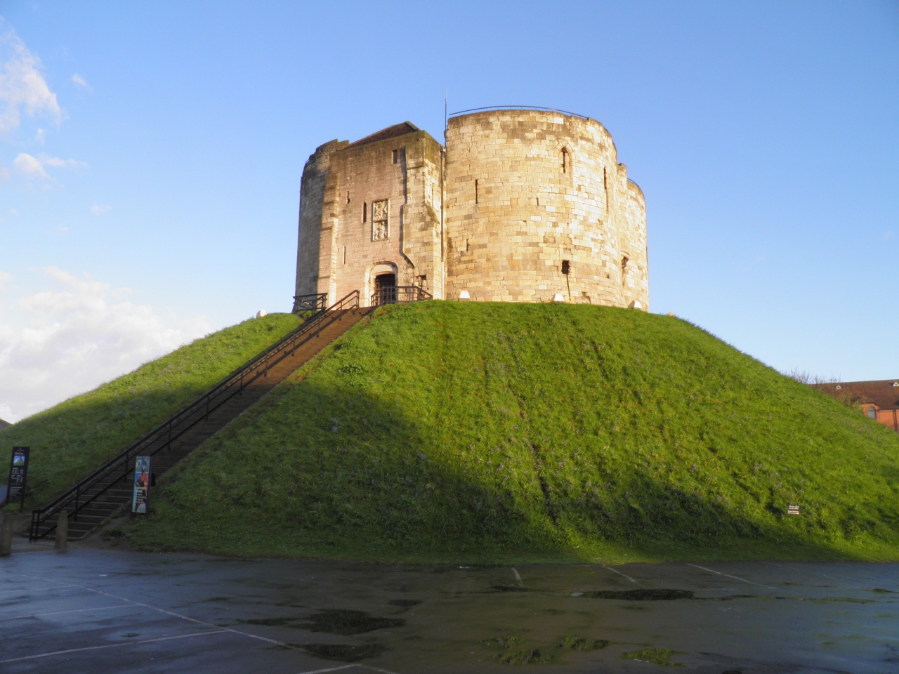 ヨーク城は1068年、ウィリアム一世が築いた。クリフォード・タワーは1270年にヘンリー3世が築いたもので、現存する唯一の遺構。1190年、150人以上のユダヤ人が死か信仰の放棄かを迫られ、虐殺されている。
