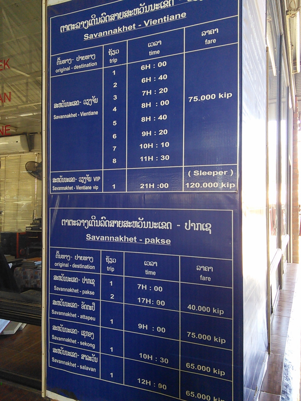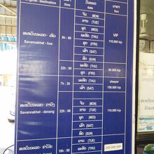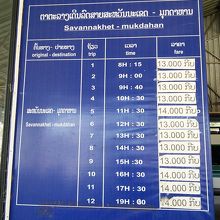しっかりとチケットカウンセラーがありムクダハン,ベトナムへの国際バス、ラオス各地へのバスの出発時間と料金が表示されているのでとても分かりやすいです。詳細は写真を見て下さい。