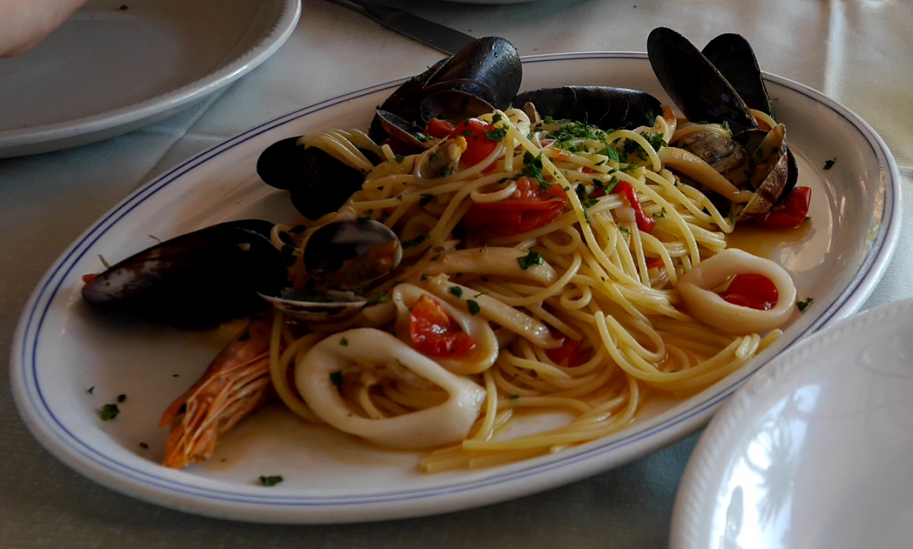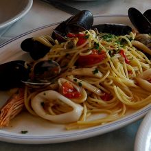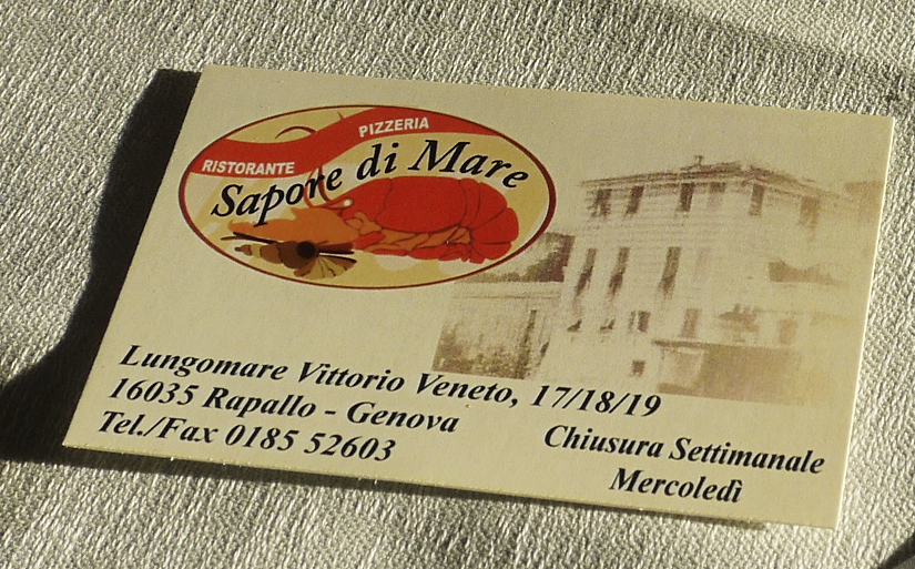 Rapalloの海岸べりにあるレストラン.焼いた魚介プレートがとてもおいしかった.素材の味を生かしレモンと塩だけで食べる.しょうゆがあったらいいね.22ユーロ,ペスカトーレ12ユーロ.ムール貝の煮込み9ユーロと手ごろ.ビール4.5ユーロ,コーヒー1.5ユーロ,チンクエテッレの白ワイン22ユーロ.雰囲気も開放的で,リヴィエラに来た雰囲気.入っていいレストラン