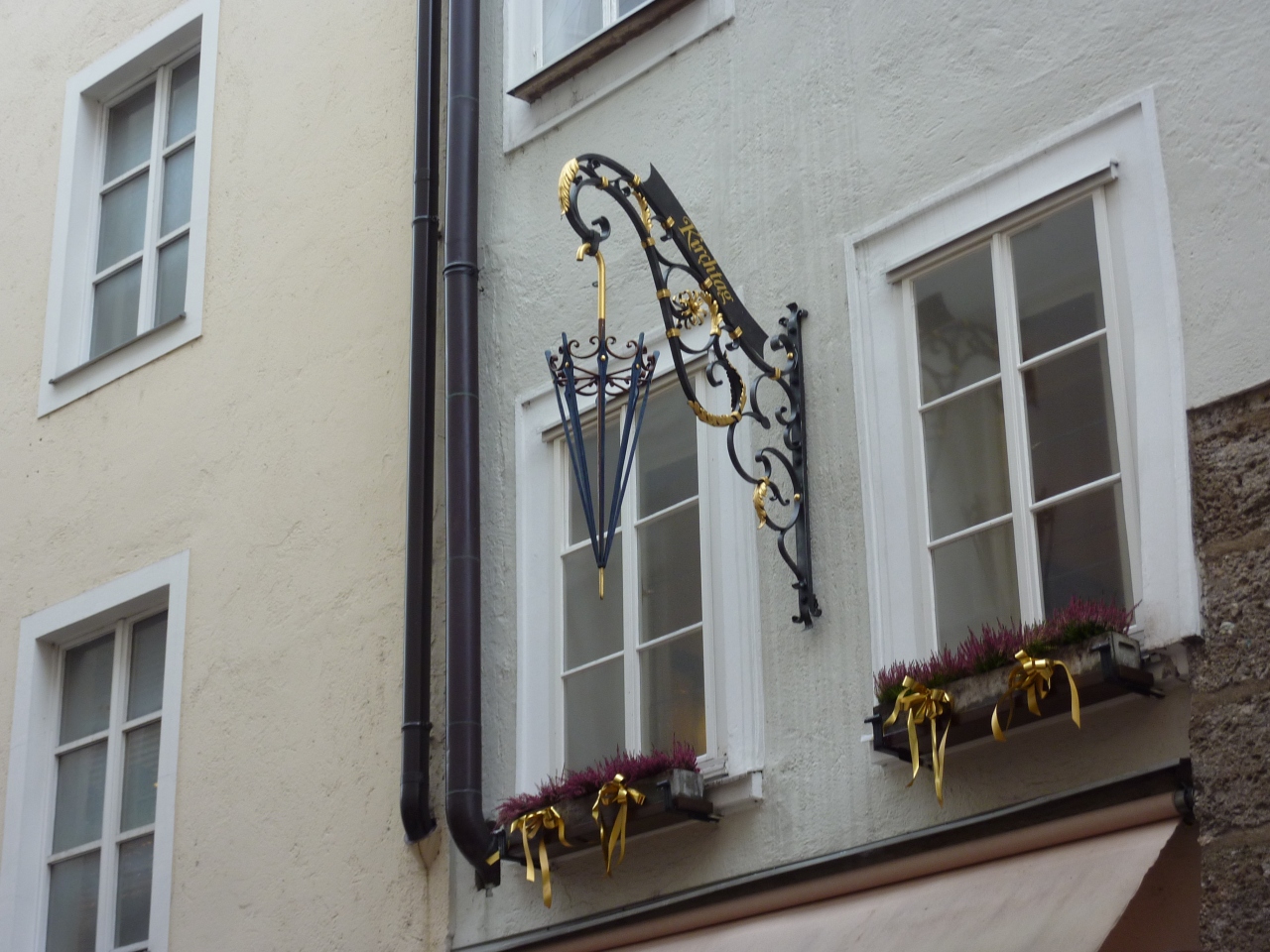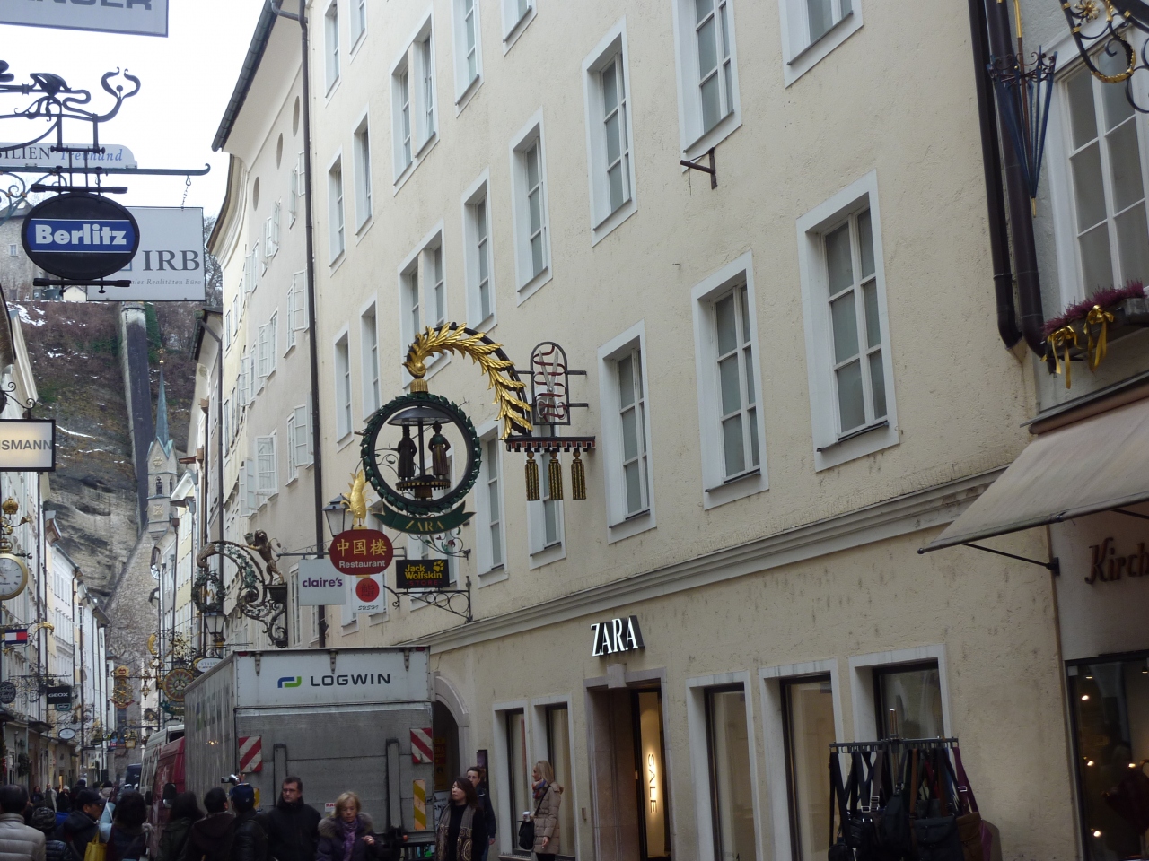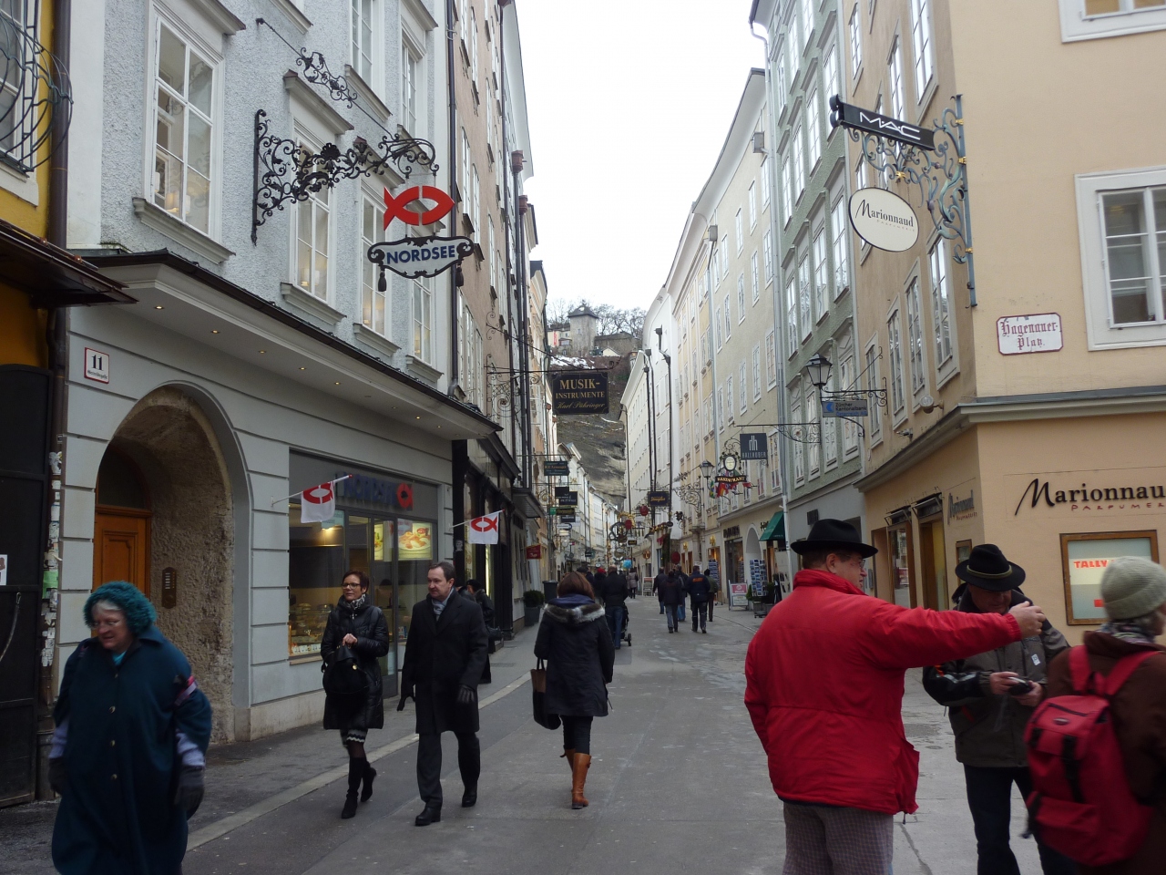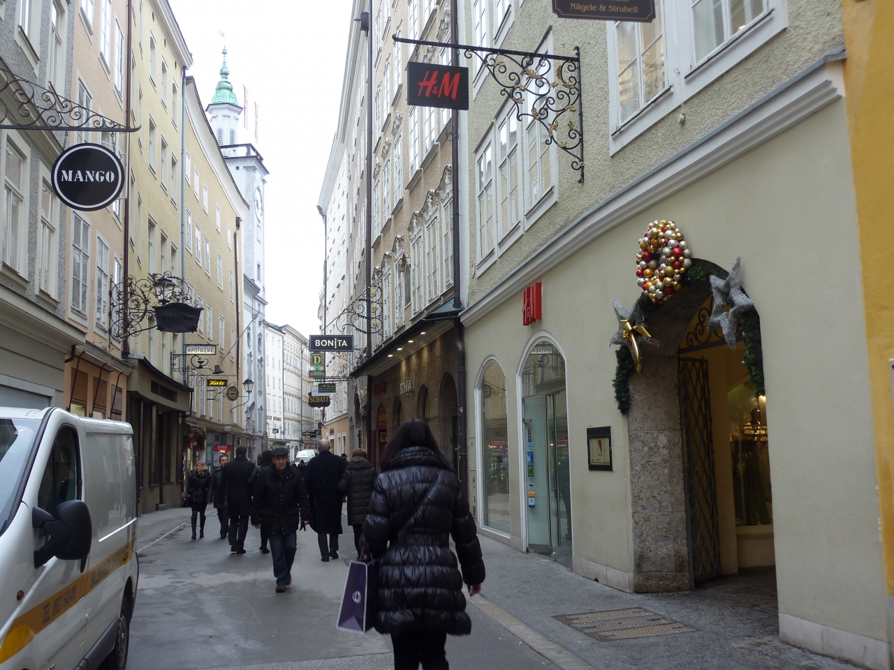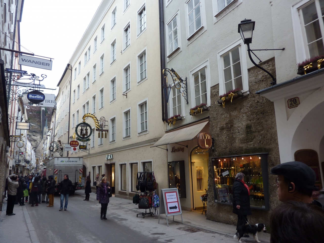 モーツァルトの生家がある通りで、旧市街の繁華街になっています。そのため余り広くない道路は人が行き交いチョット混雑しています。
