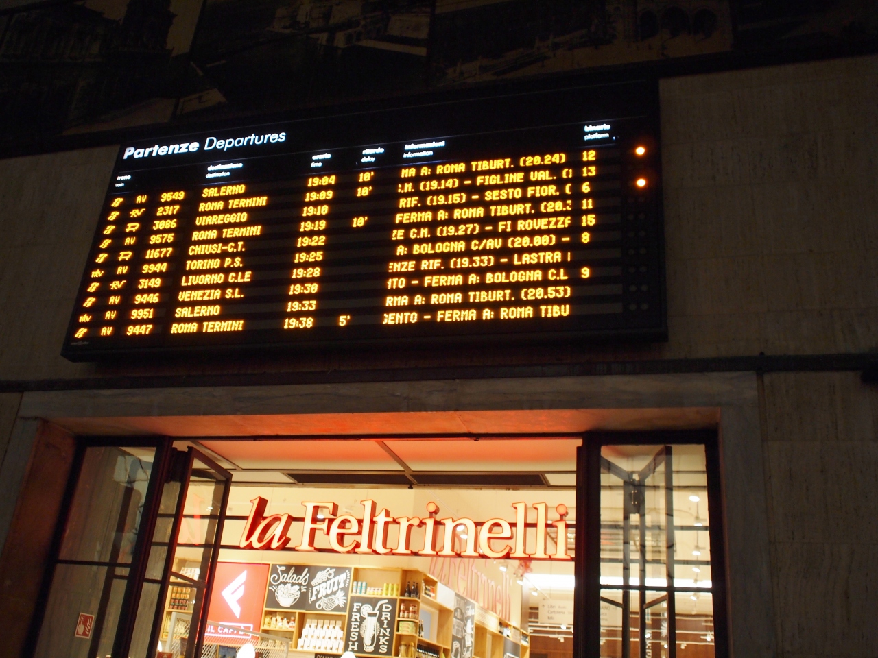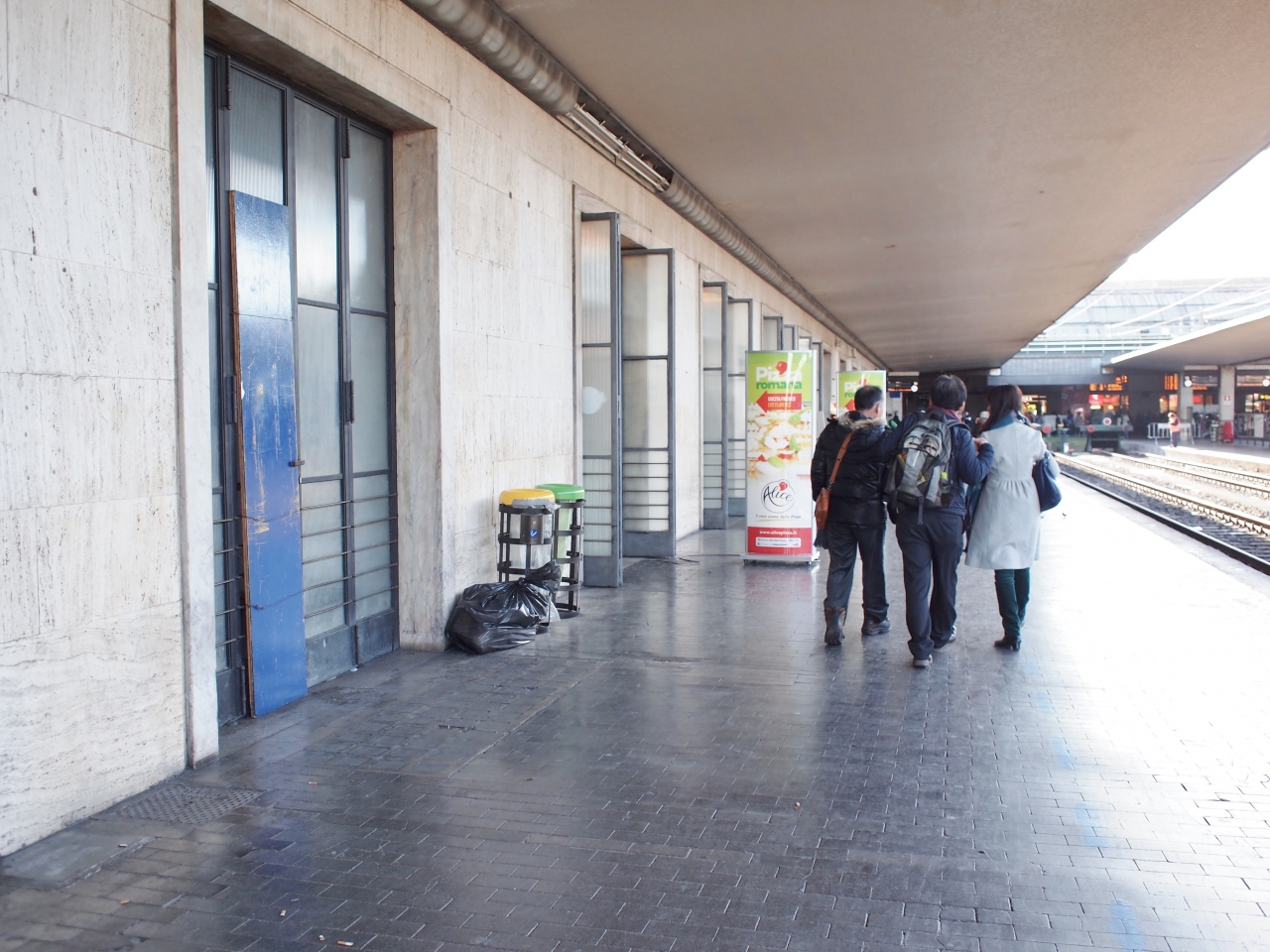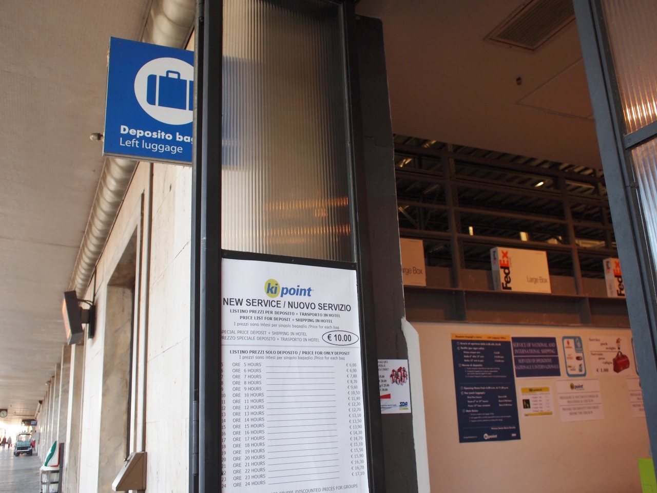 ドゥオーモにも近く、大きなフードコートや書店もあります。ただ日曜日夕方6時過ぎになると、マクドナルドも含め他の飲食店が閉店してしまったのには驚きました。荷物預かり場所は、一番右端(駅から向かって)のホーム内側にありました。