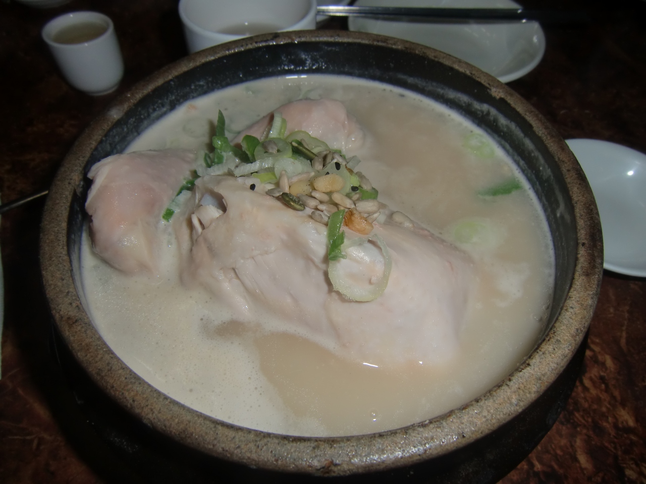 景福宮から歩いて行きました(横道に入るところがわからず、通行人に場所を聞きました)。昼食時で、店の前には少し行列ができていましたが、回転が早くそれほど待たずに入れました。スープは薄味で、自分で塩コショウで味付けします。薬膳料理という感じで、体にとても良いような気がしました。