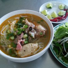 店の名前のとおりフエ名物ブンボーフエの有名店です。1杯30000ドン、皿に山盛りになった野菜や香草が付いてきます。辛いものだと思っていましたがスープは意外に薄味でさっぱりしていてとても食べやすかったです。具は牛肉とツミレと大きな骨付きの豚肉がゴロン。豚肉は脂身が多くイマイチでしたがツミレは抜群においしかったです。