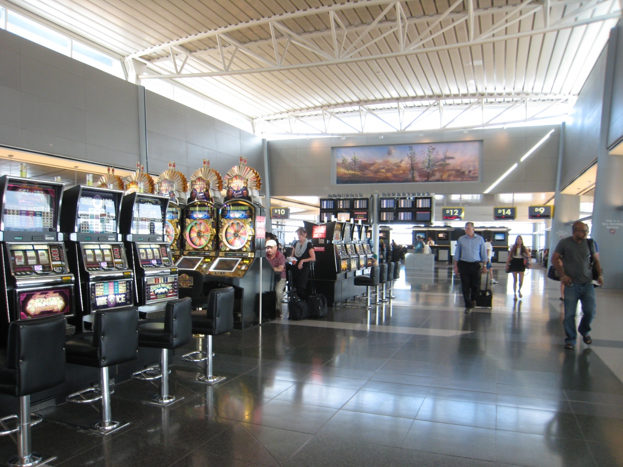 なんて言ったって、到着してすぐにスロットマシーンがあるんですから。