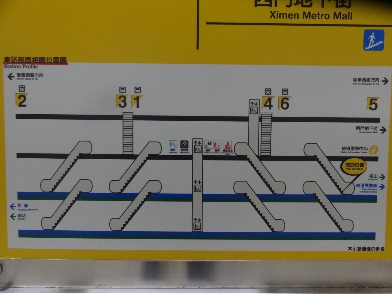 MRTは渋滞知らずで早いのはいいけど、乗換が面倒なのは嫌ですよね‥。西門駅は東行き松山新店線「松山行」と板南線「南港展覧館行」の乗換が同じホーム、反対方向はホームにあるエスカレーターで1階下のホームに降りるだけ。乗換がとても楽!