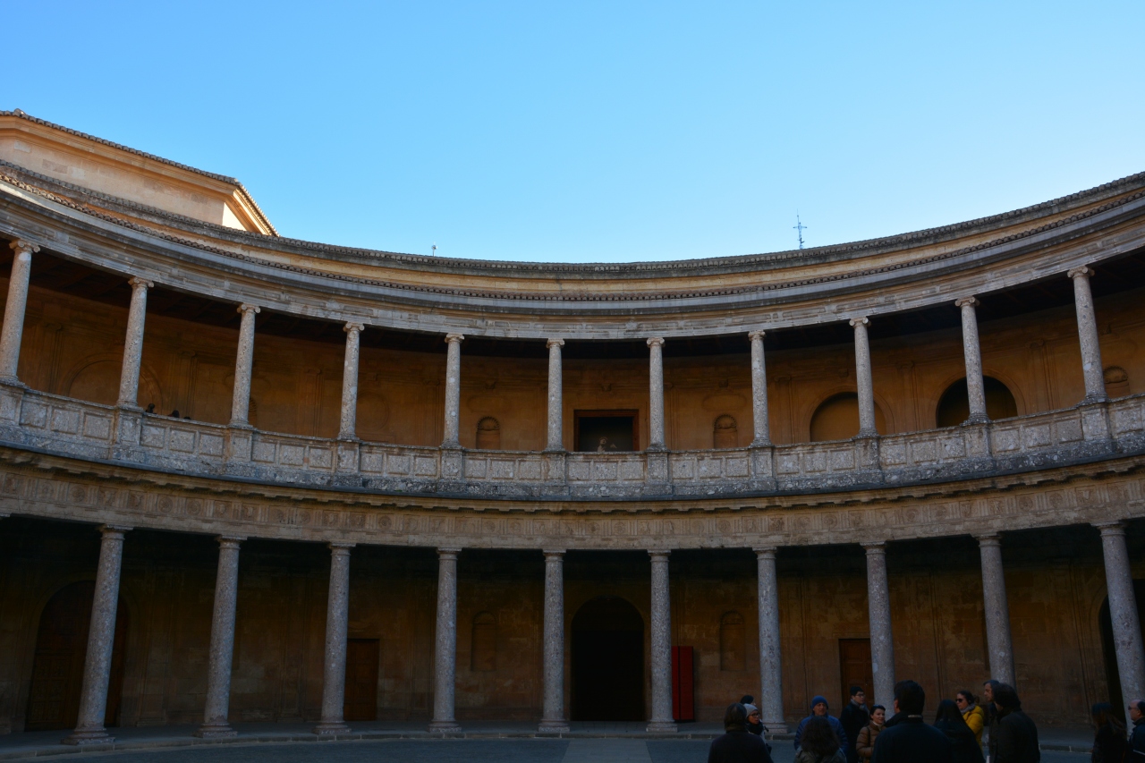 カルロス5世宮殿は一部有料だが無料で入れる建物。イスラム建築に対抗し建築を開始したのだが、資金不足となり未完に終わったそうだ。立派な外観で中に入ると、天井がなく円形競技場のようになっているのには驚いた。