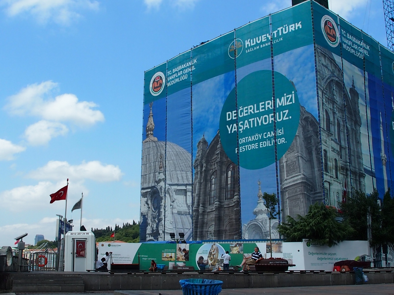 オルタキョイ散策で足を運びましたが、残念ながらジャーミィはメンテナンス中で中を拝見出来ませんでした。実寸のジャーミィの絵が書かれた仮囲いが楽しかったです。