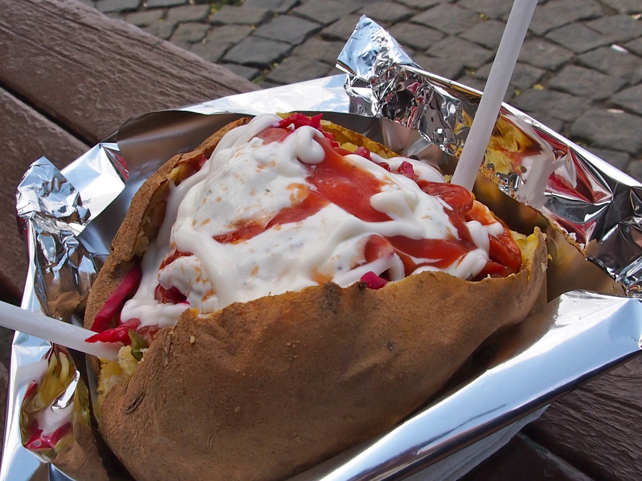 せっかくなのでクムピールをオーダーしてみましたが、特大のジャガ芋の上にコーン、ソーセージ、オリーブ、チーズ等をトッピングし、かなりボリューム感のある仕上がりになりました。