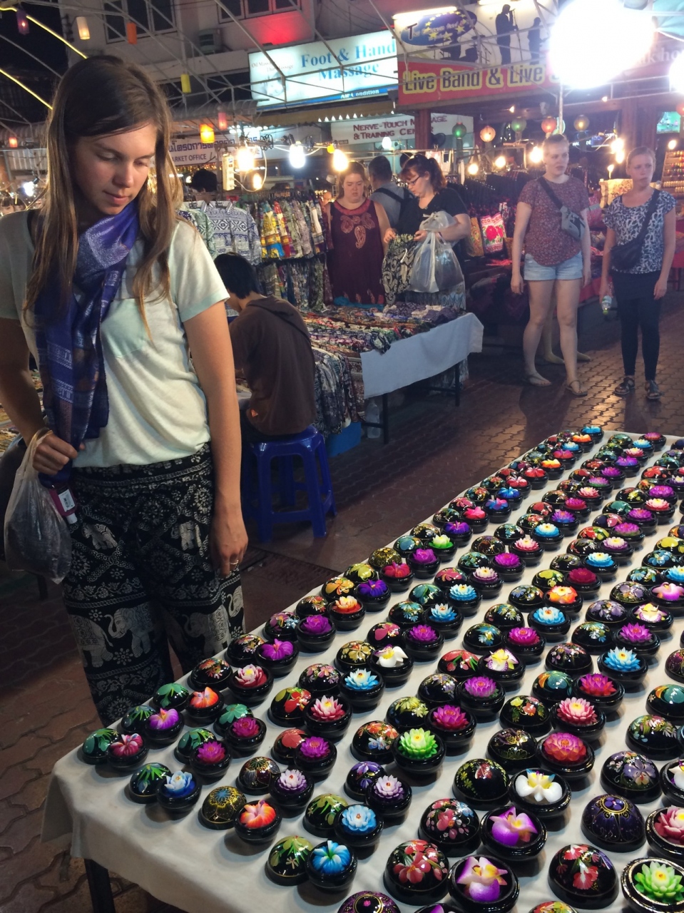 ナイトマーケットの中にある市場です。本当に多くのものが売っていて、見ているだけで飽きません。きれいなオカマさんがたくさんいて、一緒に写真を撮ってもらうとお金を取られるような感じでした。様々な種類の民芸品は見事でした。