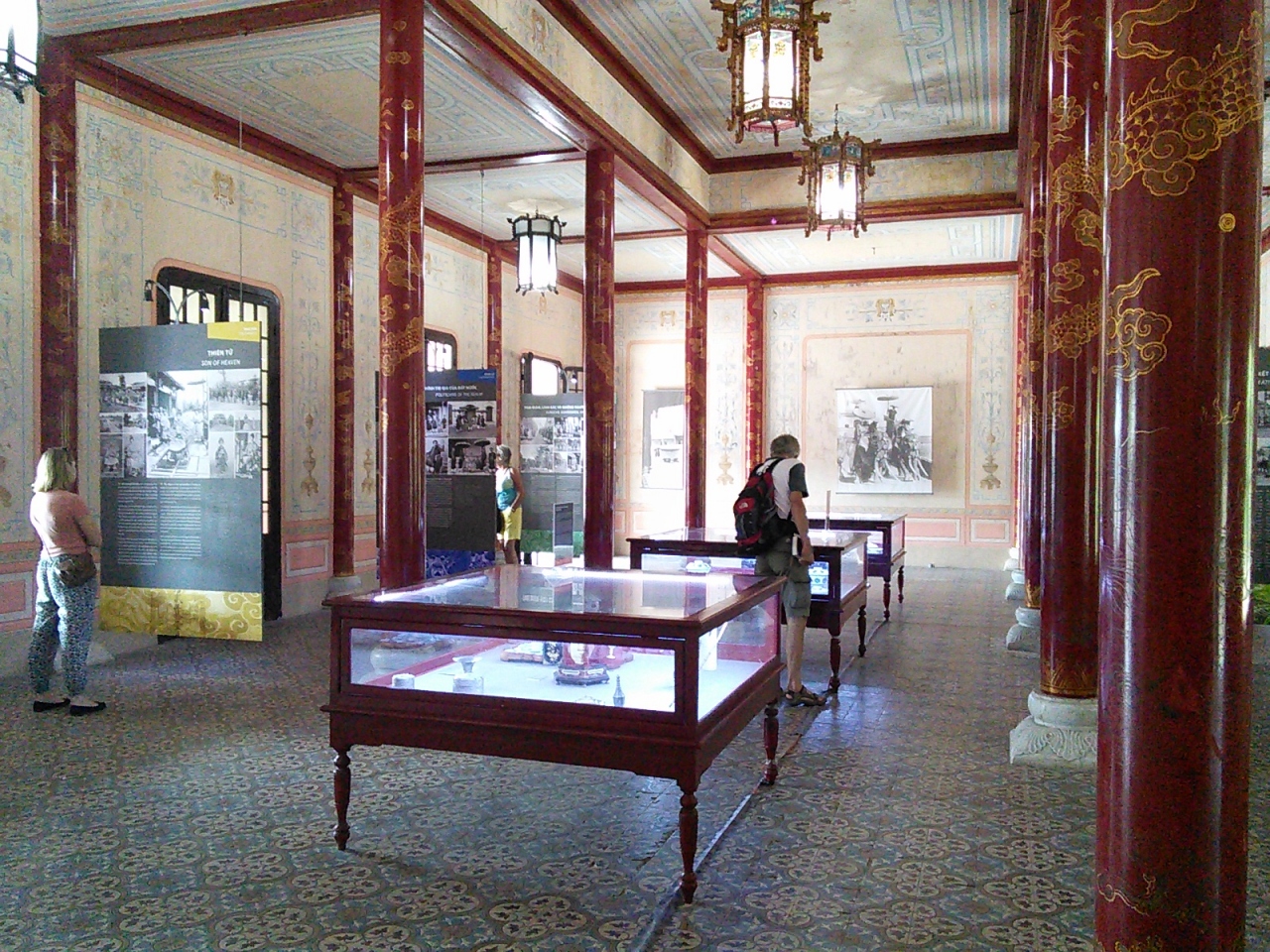 太和殿を抜けた広場の左右両端にあります。当直の高級士官の詰所だったところです。現在では右無は王宮内で使用されていた生活用具が展示されており、左無は皇帝の衣装を着ての記念撮影所になっています。もちろん旅行者も利用可、料金表には45000,75000,115000ドンと書かれています。ベトナム語のみの案内書きだったので違いを尋ねたら45000ドンは端の低いところにある椅子で、75000ドンはセット中央の高い位置にある立派な椅子に座って撮影でき、115000ドンは衣装を着た女性スタッフが両脇に立ち扇子であおいでくれている姿を撮影できるとのこと。なかなかおもしろいサービスだと思います。