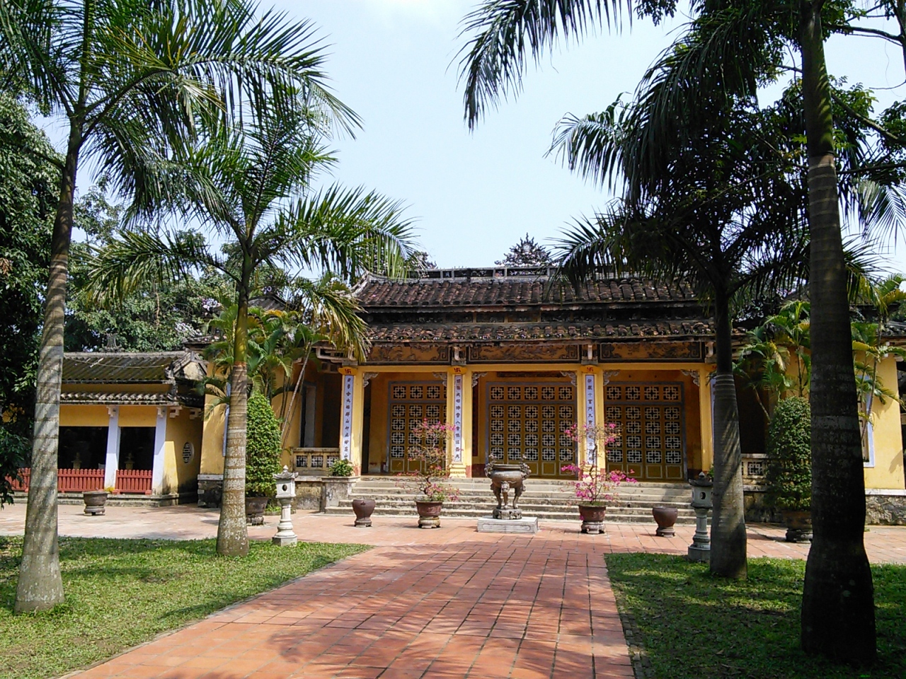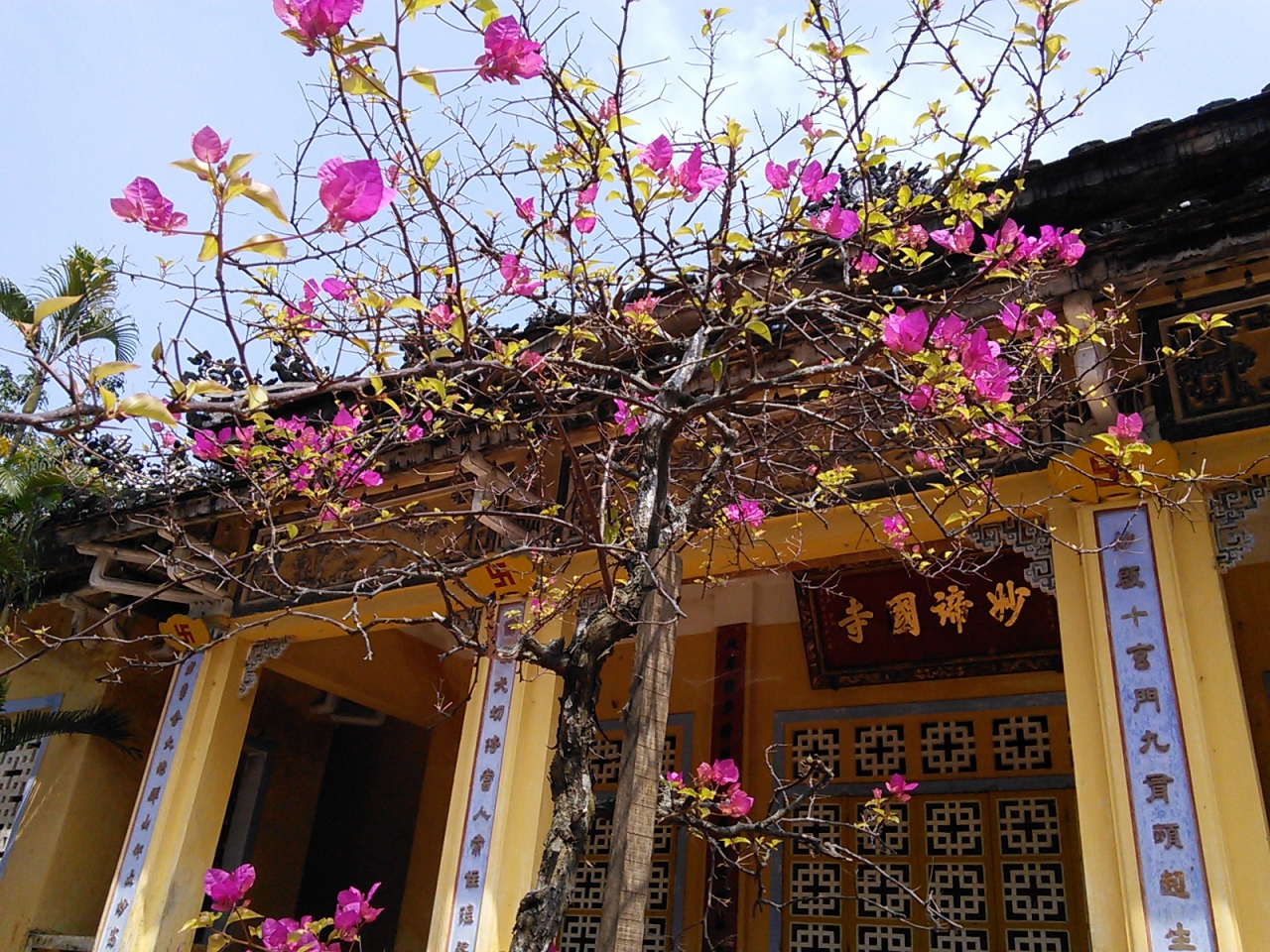 ドンバ市場の北側の橋を渡ったBach Dang通りにあります。正面の門から入ると椰子の木の通路の向こうに本殿が見えます。小さなお寺なので観光客はあまり来ないのか人は誰もおらずひっそりとしていました。扉が閉まっており内部は見れませんでしたがきれいなブーゲンビリアが咲いていました。緑に囲まれたお寺です。