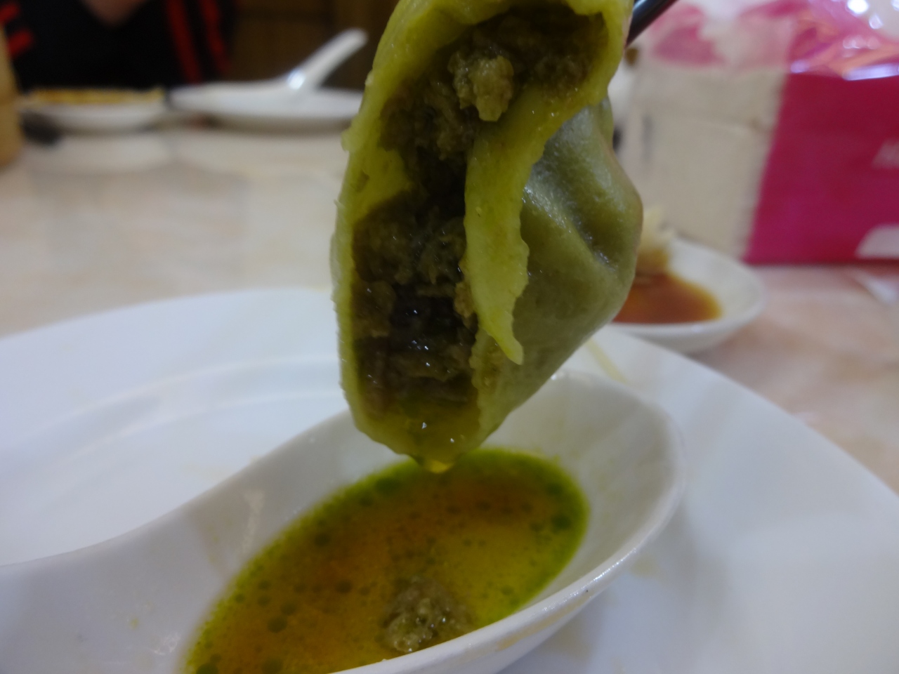 綺麗な緑色をした烏龍茶小籠包からはほのかにお茶の香りが漂い、上品な感じです。