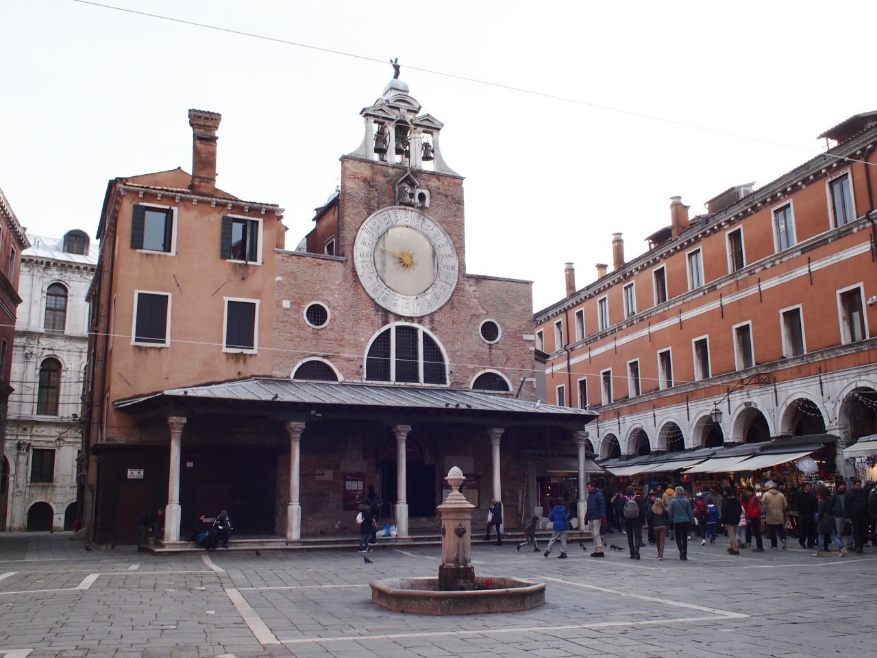 魚市場やリアルト橋の近くにある教会で、教会前は広場にもなっています。広場には衣料品や土産物店が多く、リアルト橋から行き来する人で賑わっています。この教会は何と言っても正面の大きな時計が印象的で、再建されたのは17世紀ですが、この町一番の古い教会と言われています。