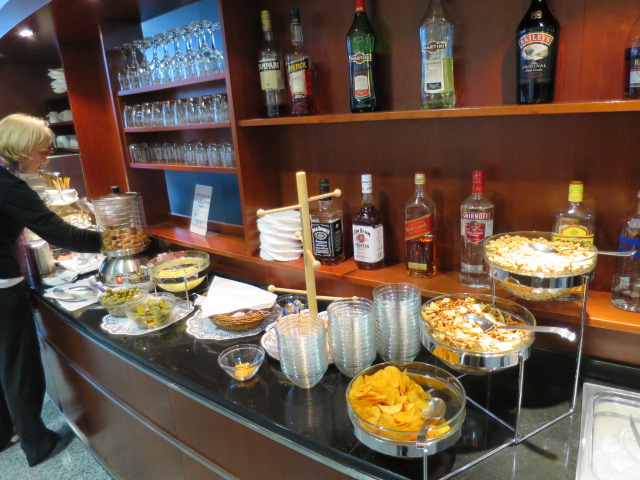 ドリンク、アルコール、ケーキ、ソーセージ、フルーツなどがおいてある、また無料Wifiも使用でき、通信速度も速くて快適。