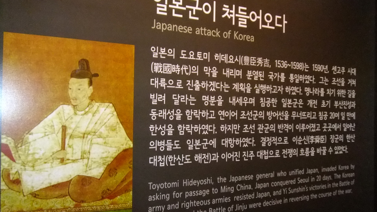 光化門広場の中(下)にある博物館。李瞬臣といえば、日本の豊臣秀吉軍を亀甲船を駆使して撃退したという、韓国の英雄(?)。ということで、その船のちょっと小さいやつ(戦争博物館にはもっと大きいやつがあった)や、功績・秀吉についてなどが説明されていた。