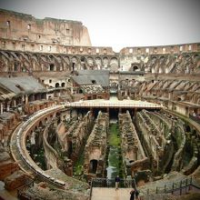 コロセッオは現在はかなり修復されて外壁とかは結構キレイになっていますが、中は崩れ落ちた柱が昔の状態そのままゴロゴロ転がっています。 コロッセオは、紀元80年から、闘技場として使われた場所。 1900年以上もこの場所に佇み、ローマの歴史を見てきた建造物に実際に足を踏み入れて、歩いて観光出来る事に、感動しっぱなしでした。 地下にあった施設(動物の檻や、囚人がとらわれていた場所など)が、現在はむき出しの状態になっているので、じっくりと見学できます。