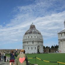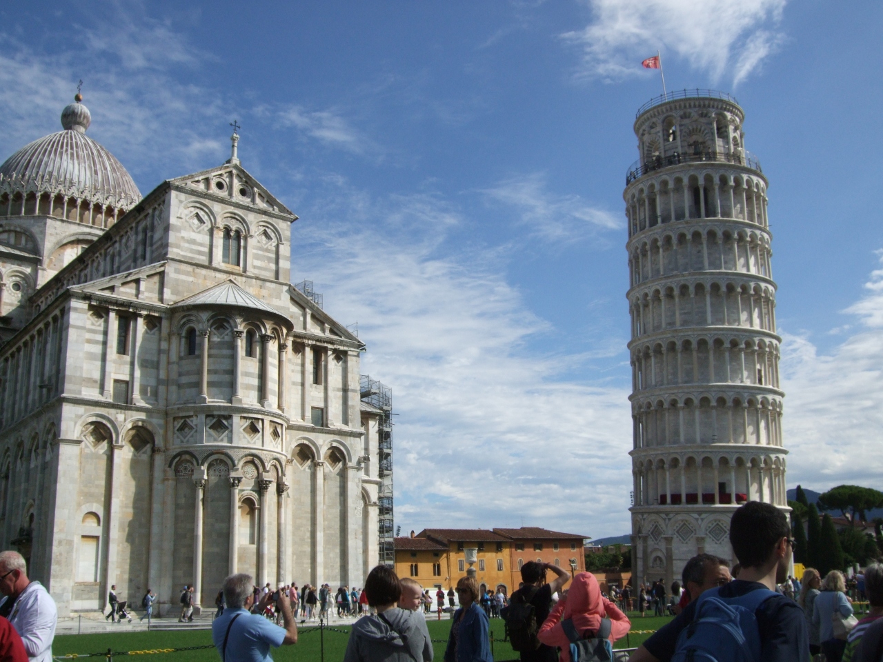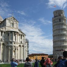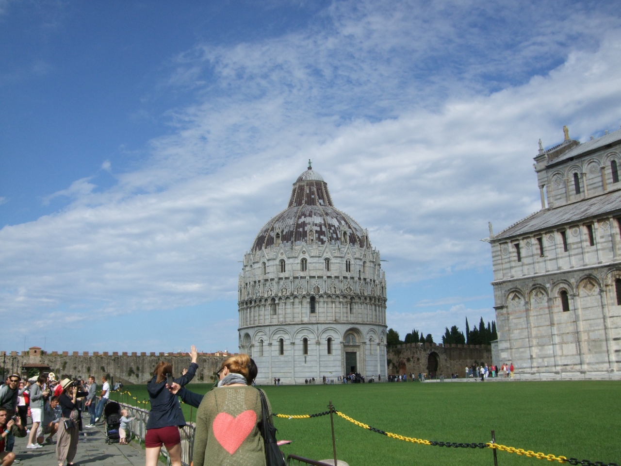 ローマから電車でオルヴェート1泊、フィレンッエ1泊の小旅行で、ピサの斜塔観光もできました。フィレンッエから電車で1時間、ピサ中央駅から徒歩30分くらいで、この奇跡の広場にたどり着きました。広場の周りには、お土産屋さんのテントやカフェのテラス席、帽子やミサンガ売りの売り子たち、そして多くの観光客が、思い思いの記念写真を撮ってました。手前から、洗礼堂、ドゥオモ、斜塔と並んでいました。