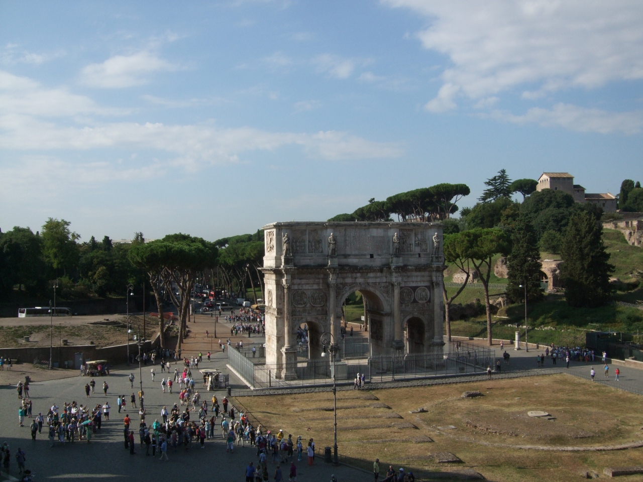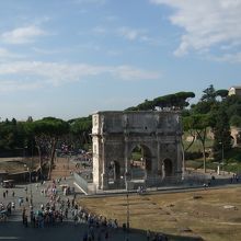 コロッセオの隣にある高さ25mの凱旋門で、ローマに数ある凱旋門の中でも最大のものです。315年に建築されたもので、コンスタンティヌス帝が、312年ムルヴィウス橋の戦いで勝利し凱旋したことを記念したものです。2枚目の写真は、コロッセオの中から撮影したものです。フォロロマーノの瓦礫のような遺跡の中で、この白く美しい凱旋門が一際目立っていました。見応え有りました。