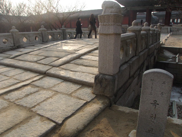 昌慶宮の入口の門である弘化門を抜けてすぐにある橋がこちらで、他の王宮と比較しても判る通り、ソウルの王宮は風水的な意味合いでまず水路を越えていくことになりますが、昌慶宮に関してはこちらの橋が該当します。弘化門を見るのにも、最初の内門である明政門を見るのにも良い所で、観光客的視点からは昌慶宮の典型的な撮影スポットとして覚えておかれると良いかと思います。