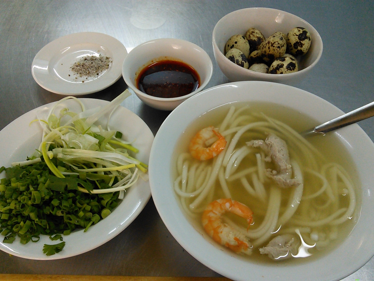 メニューは大(TO DAC VIET)20000ドン, 中(TO THUONG)15000ドン, 小(TO NHO)10000ドンのみ。“中”をオーダー。透き通るスープの中の麺に豚ミンチのつみれとエビがのっています。別皿のネギをすぺて入れひと口、
