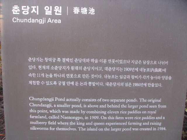 昌慶宮のより自然豊かな風情を満喫できるエリアの中央にあるのがこちらの大春塘池です。池岸を巡る遊歩道が整備されているのですが、私が訪問した冬季は、凍結と暖気による融解を繰り返している風情の土道がぬかるんでいて非常に歩き辛かったです。同じ理由で雨の日もあまりお勧めできない道ですので、そういう場合は上段に続く舗装道を歩かれることをお勧め致します。