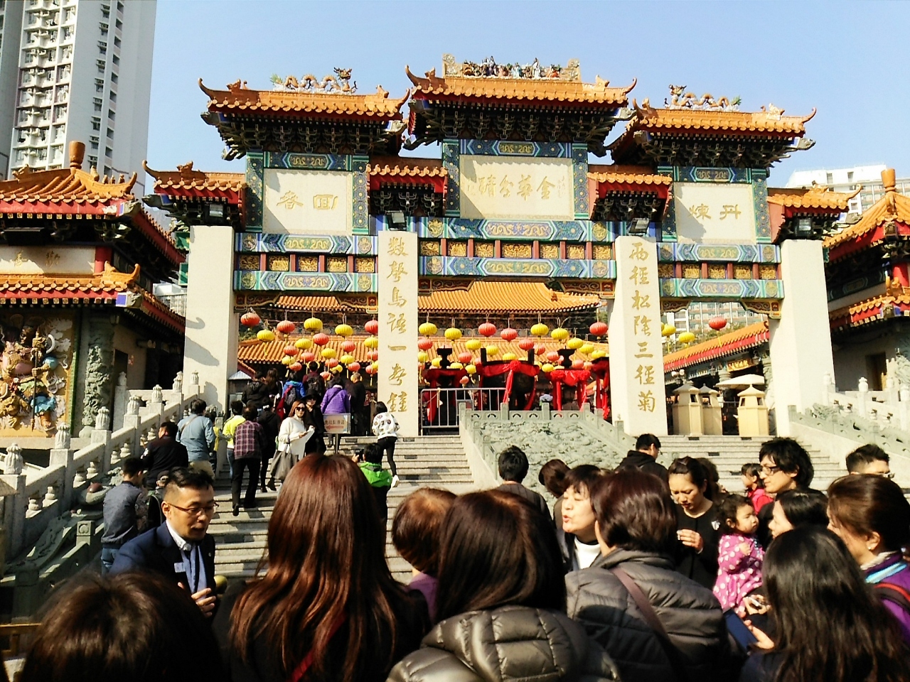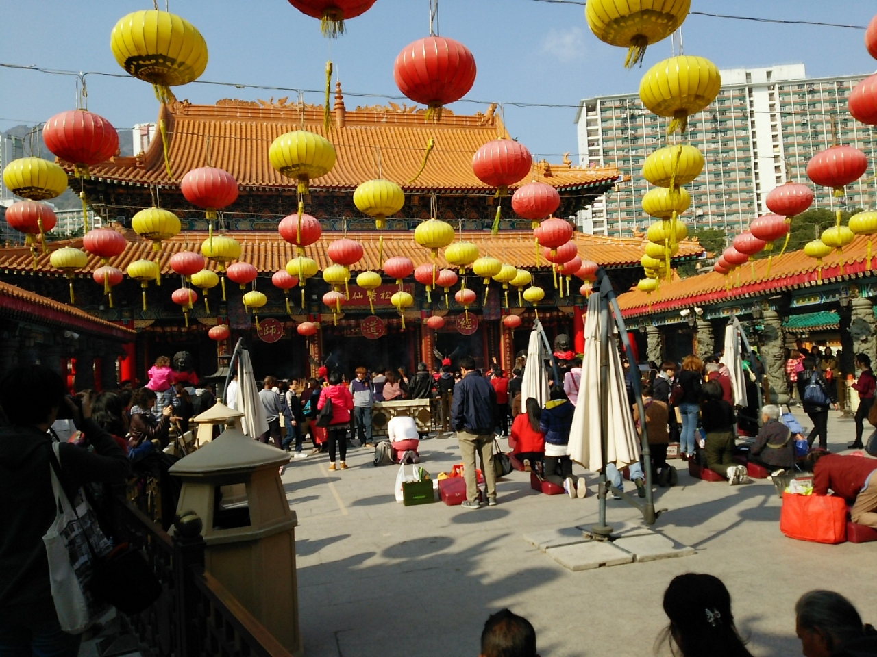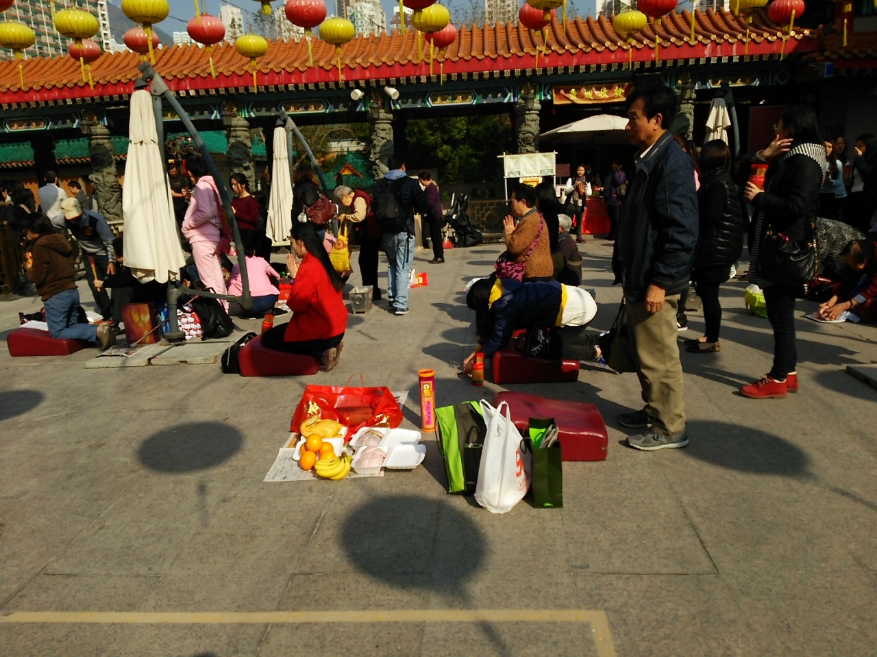 車を降り立った瞬間から線香くさい!煙っています・・・実に中華な建物のお寺です。境内が願掛けの人用に区切られていて、その中で料理などの供物と沢山の線香を前に何かを頼んでいます。ほんとにすごい量なんです。線香・・・。