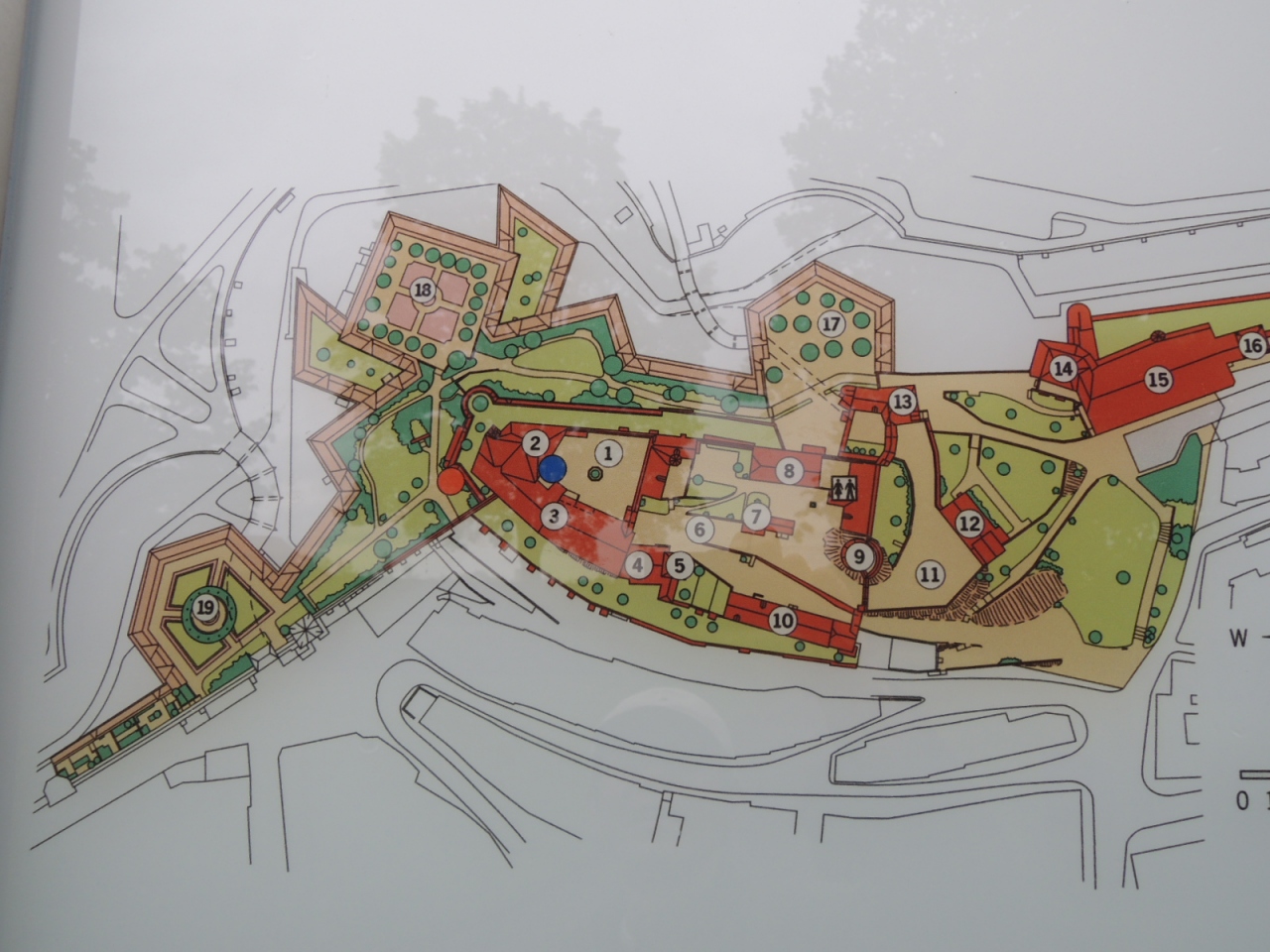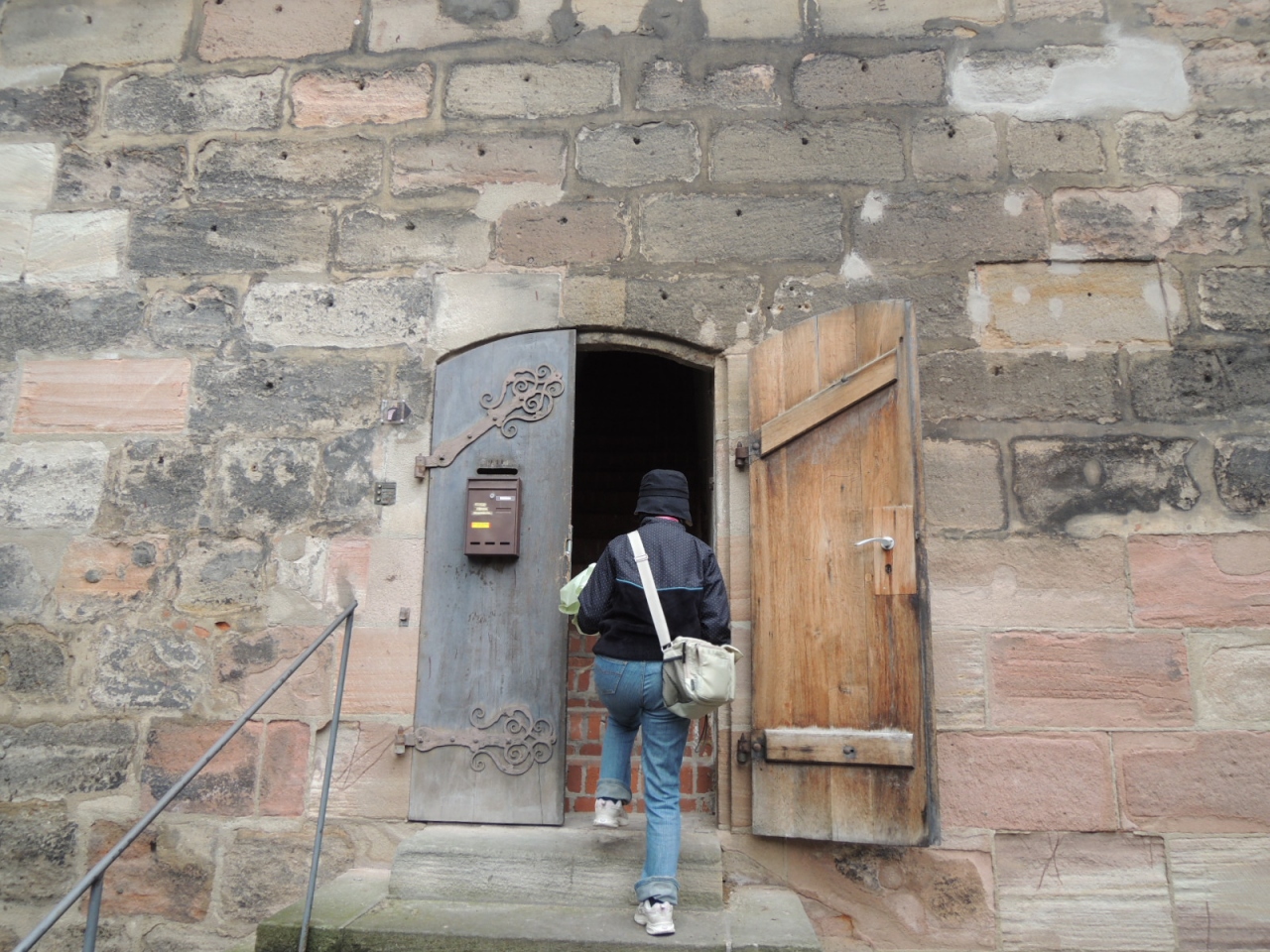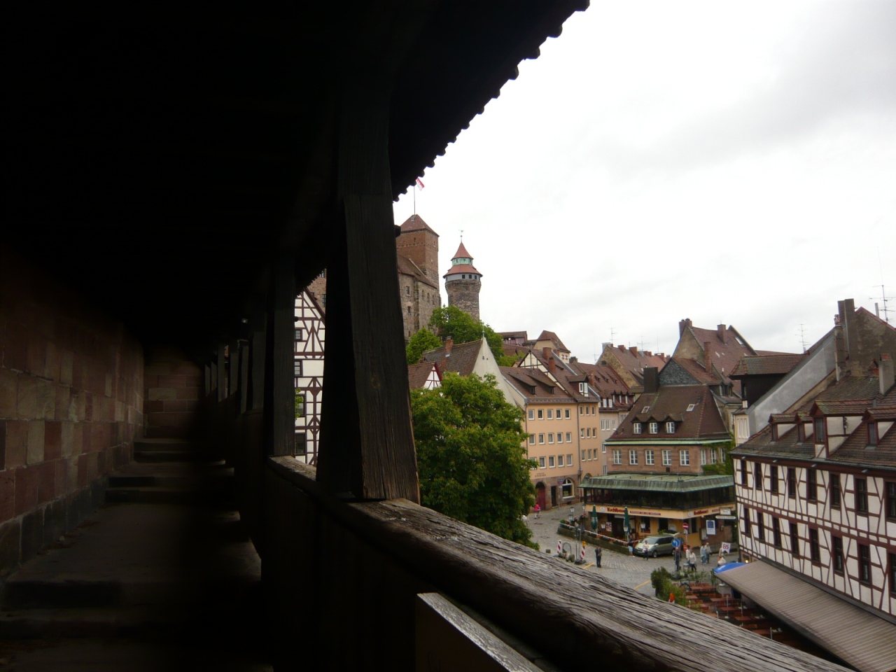 北西の角にある新門を入ると扉があったので上がってみると上は幅のあるお庭になっていました。さらに開放されていた扉をくぐると、城壁の上の回廊に出て一部だけ歩けるようになっていました。回廊からは、大戦の戦火を逃れ昔のまま残っている木組みの家や、石造りの建物が見れます。