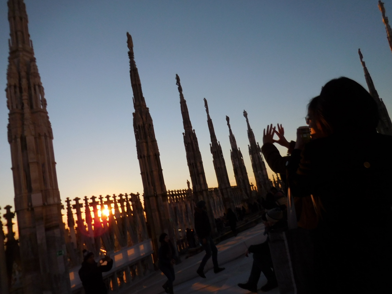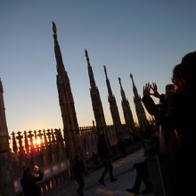 屋上に上がるエレベータは、聖堂向かって左側、正面入り口を6時として10時の方向にありますが、チケット売り場は正面向かって右側、4時の方向にありますので、先にエレベータ入口に行くと、ドゥオモの周りを1周することになります…。