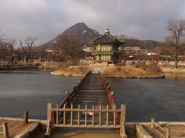 景福宮はかなり広い王宮ですので、急ぎのツアー観光客の場合、その多くはこの辺りまでは足を延ばさずに引き返すことが多い様に感じられます。それ故、このエリアは常に賑わいを見せる景福宮の中では、比較的静かな時間を過ごせることが多くて、人混みが苦手な方にはよりお勧めな所です。池の中央の中島にこの”あずまや”が設置されている感じですが、通常はここに至る通路が閉鎖されているので、立ち入ることは出来ないのが残念でした。