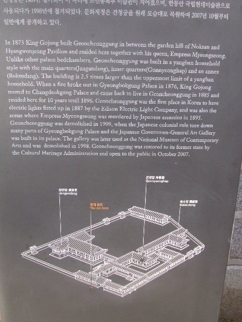 少し古い文献を読んでいると、景福宮内には、日本人にとっては忘れてはならない閔妃暗殺の舞台として出てくるのがこちらで、以前はこの史実に関する碑なども建立されていたようですが、現存の乾清宮自体が2007年にリニューアルされて復元された所で、その際にこれらの碑は王宮外へ移築されたとのことでした。ただ、やはり近代の日韓史を考える上で、この事件の重要性は低くはありませんので、ここに立ち寄った際は是非悲しい歴史にも思いを馳せながら見物したいものです。