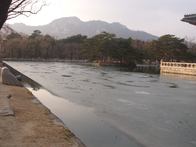 景福宮を代表する景観としてここを連想される方も多いかと思います。簡単に言ってしまえば人工池に浮かぶ二階建の巨大な楼閣のような建造物ですが、韓国最大の高架式木造建築としても知られています。2階部分には三つのフロアがあって、それぞれが天・地・人を、そしてそれを取り囲む12のフロアが12か月を、更に建物を取り囲む24の柱が二十四節気を象徴しているという意味で、東洋哲学の思想が体現された素晴らしい建造物となっています。ここから西側に望める仁旺山の風景もとても美しいので是非お見逃しなく!